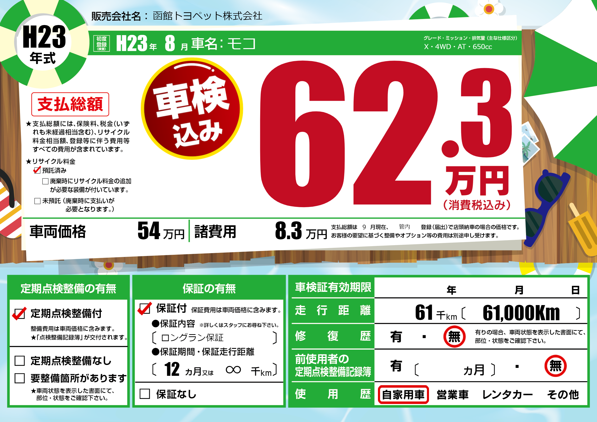 | 走行キロ | 6.1万km | 初年度登録 | H23年8月 |