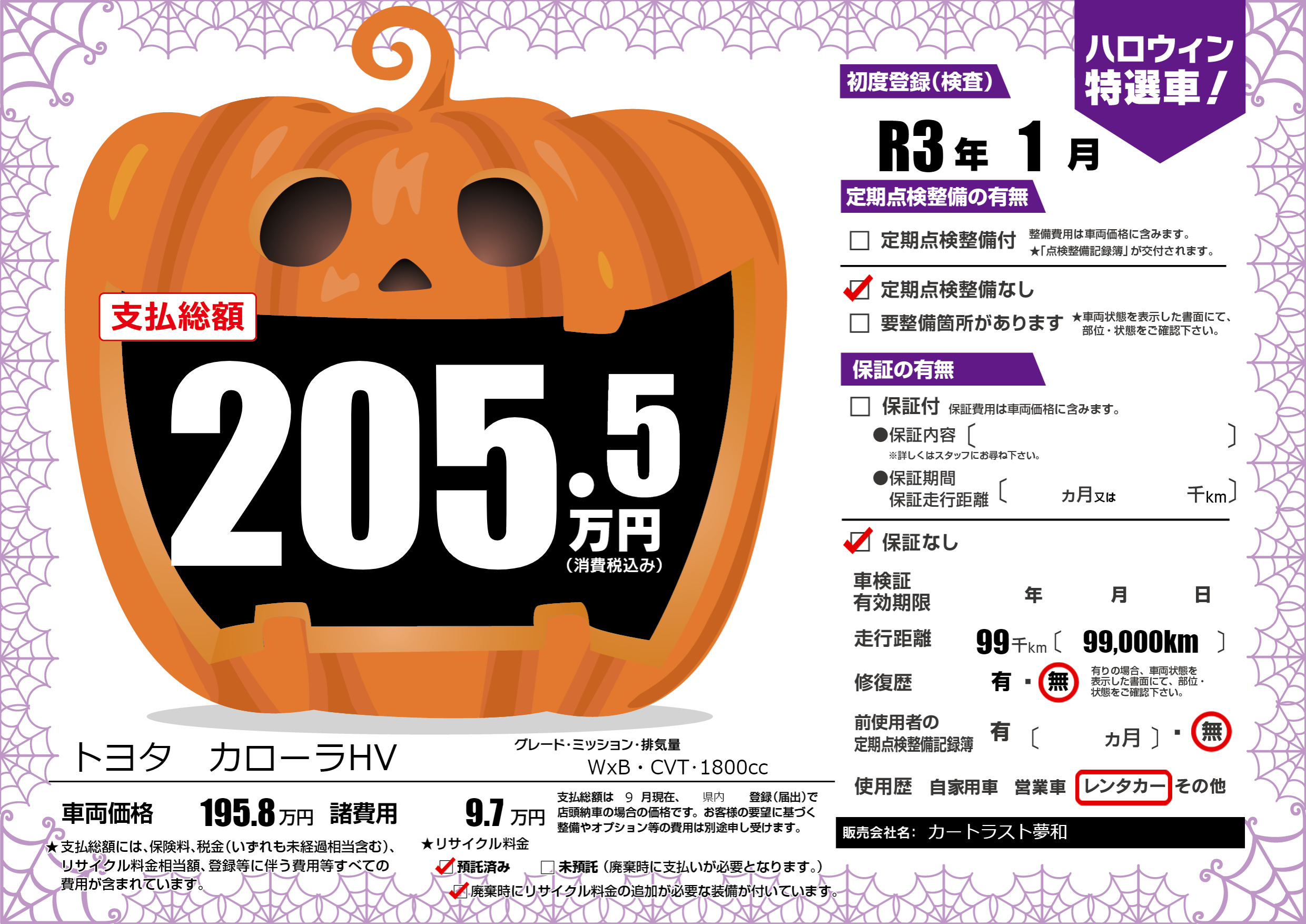 | 車名 | トヨタ カローラHV | グレード ミッション 排気量 |