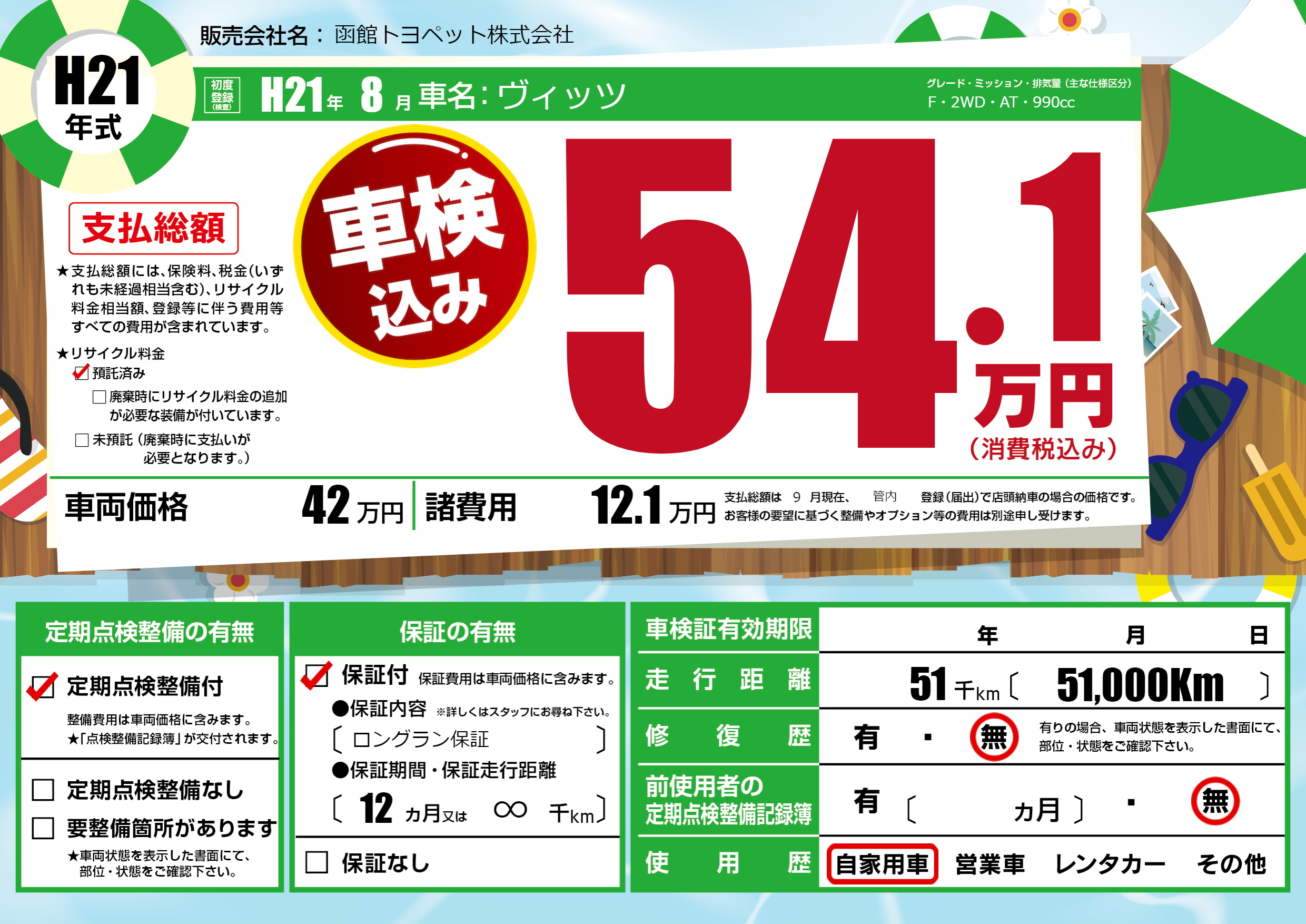 | 走行キロ | 5.1万km | 初年度登録 | H21年8月 |