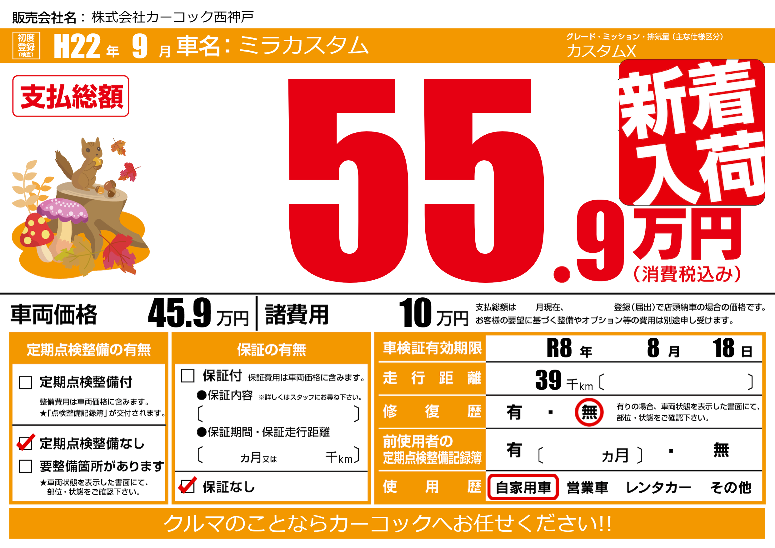 | 走行キロ | 3.9万km | 初年度登録 | H22年9月 |