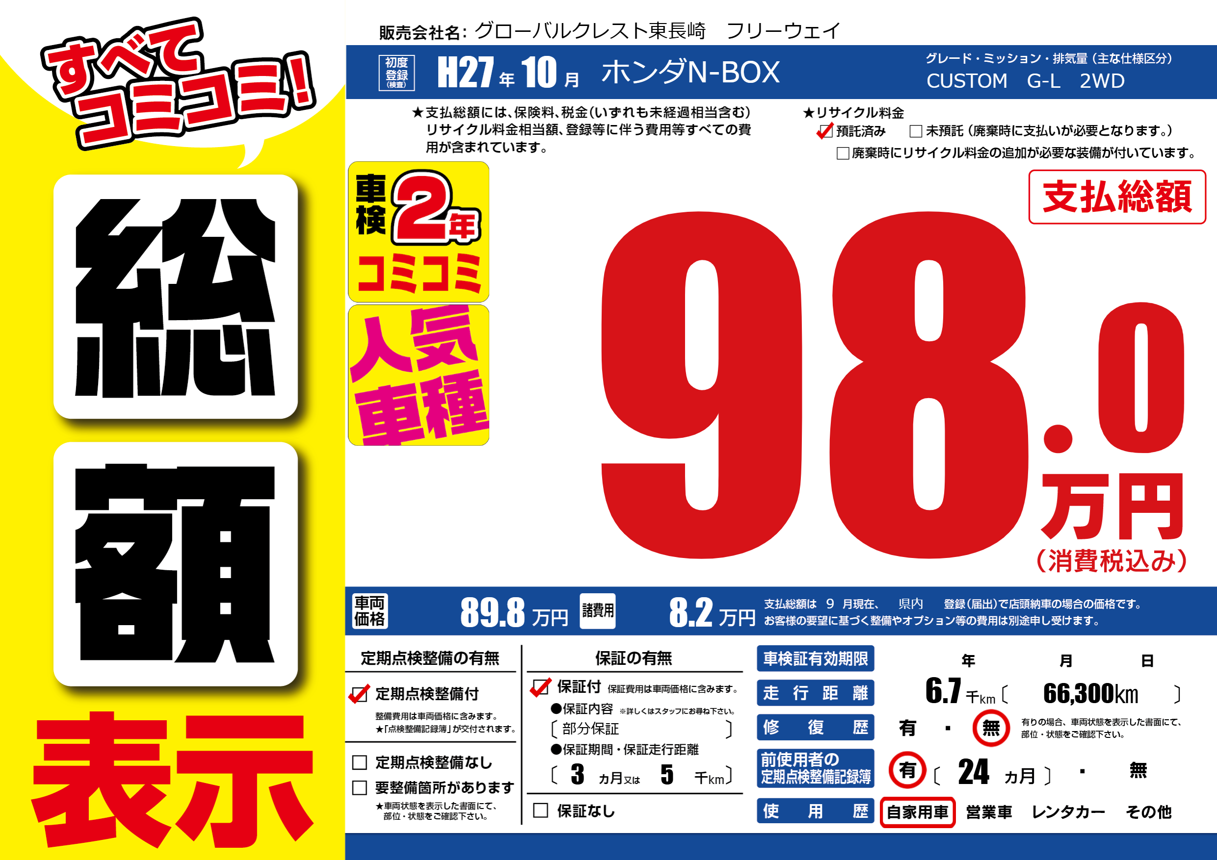 | 車名 | ホンダN-BOX | グレード ミッション 排気量 |