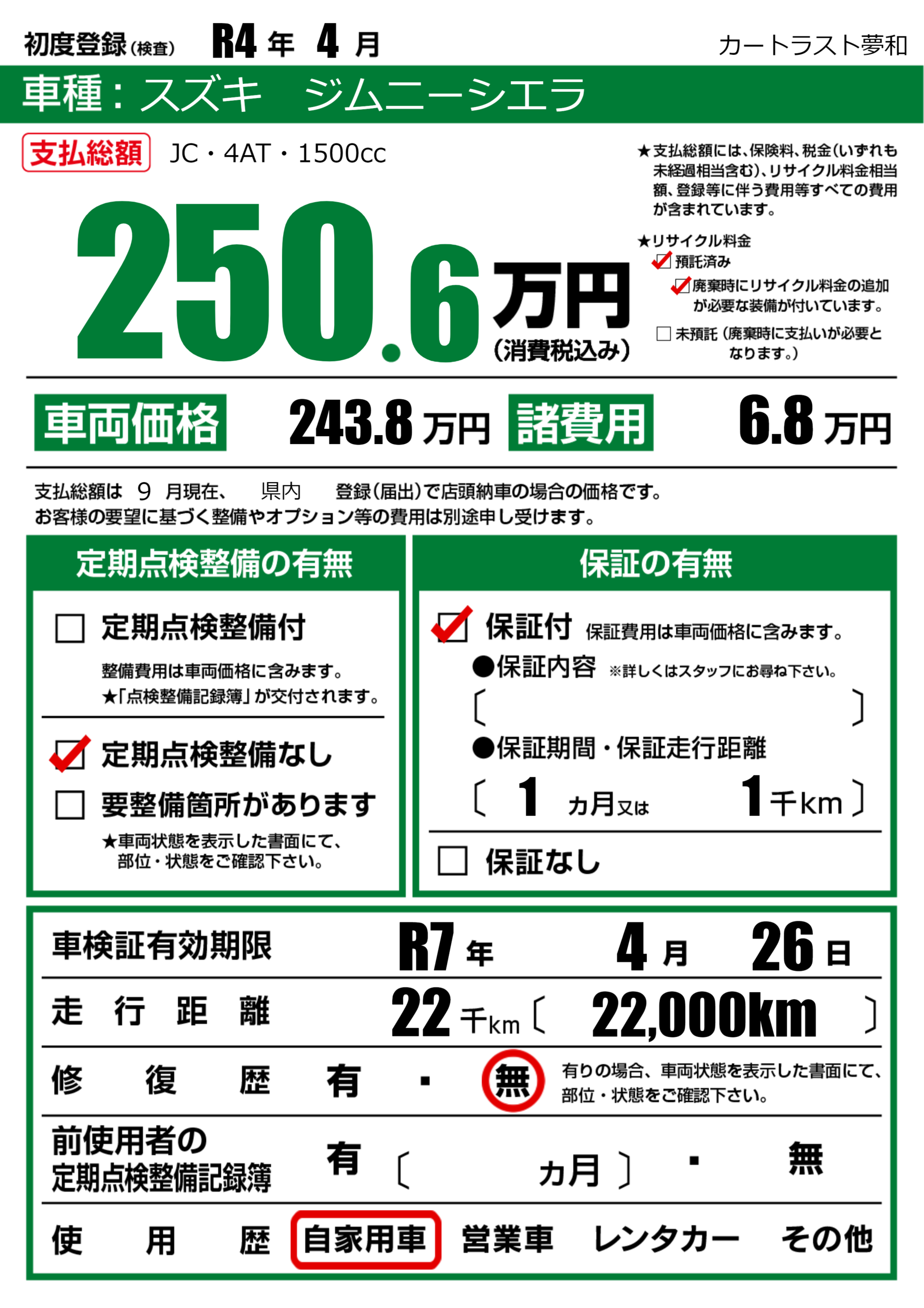 | 走行キロ | 2.2万km | 初年度登録 | R4年4月 |