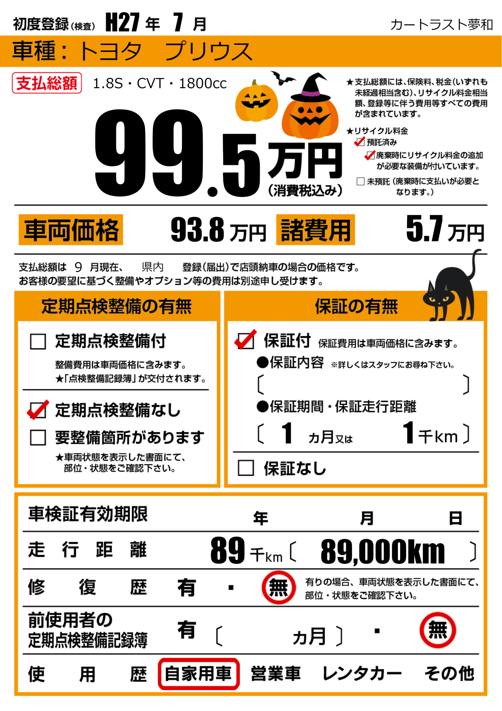 | 車名 | トヨタ プリウス | グレード ミッション 排気量 |