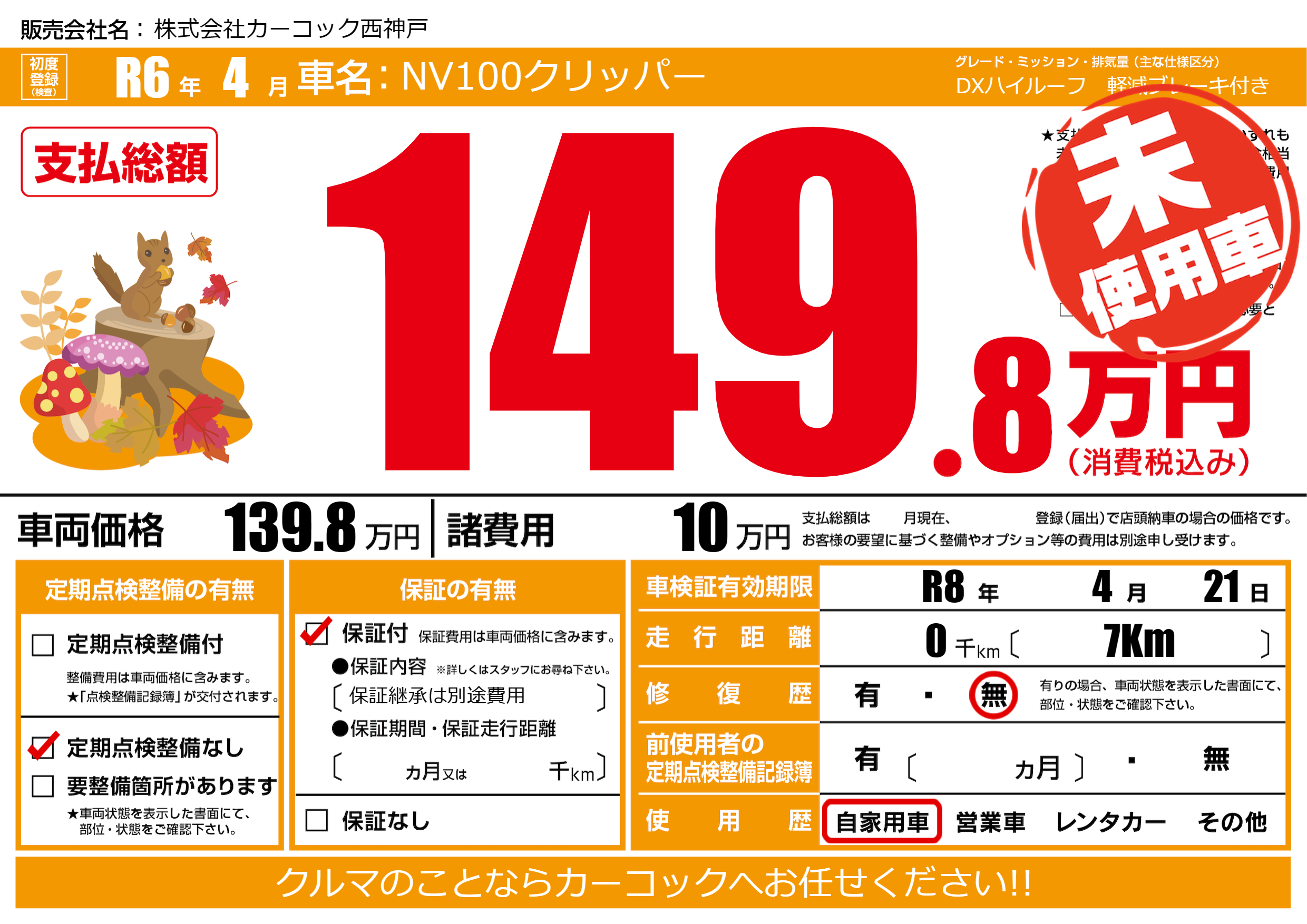 保証付き 保証内容(保証継承は別途費用) ---ヶ月または()千kmまで |