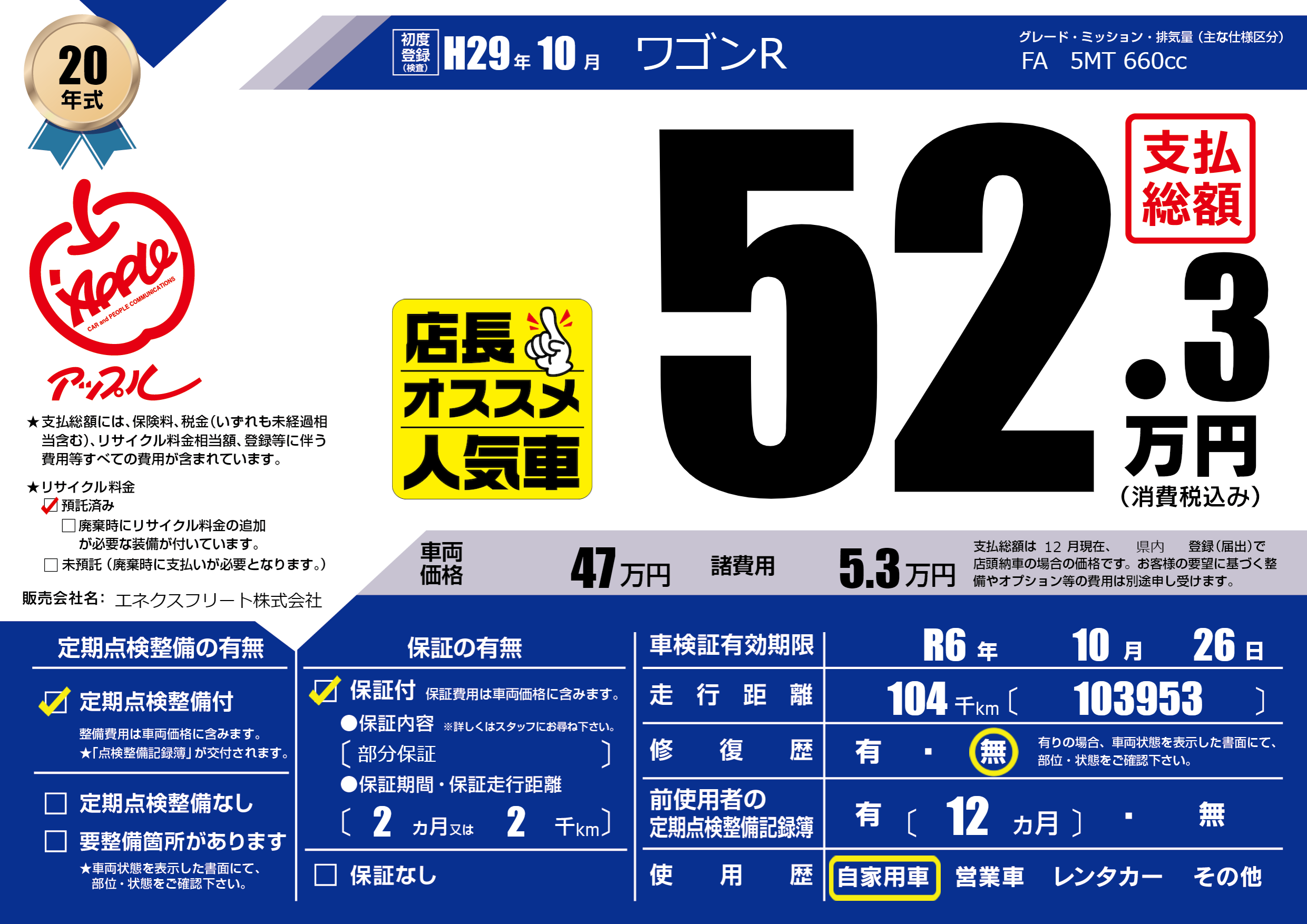 | 車名 | ワゴンR | グレード ミッション 排気量 |