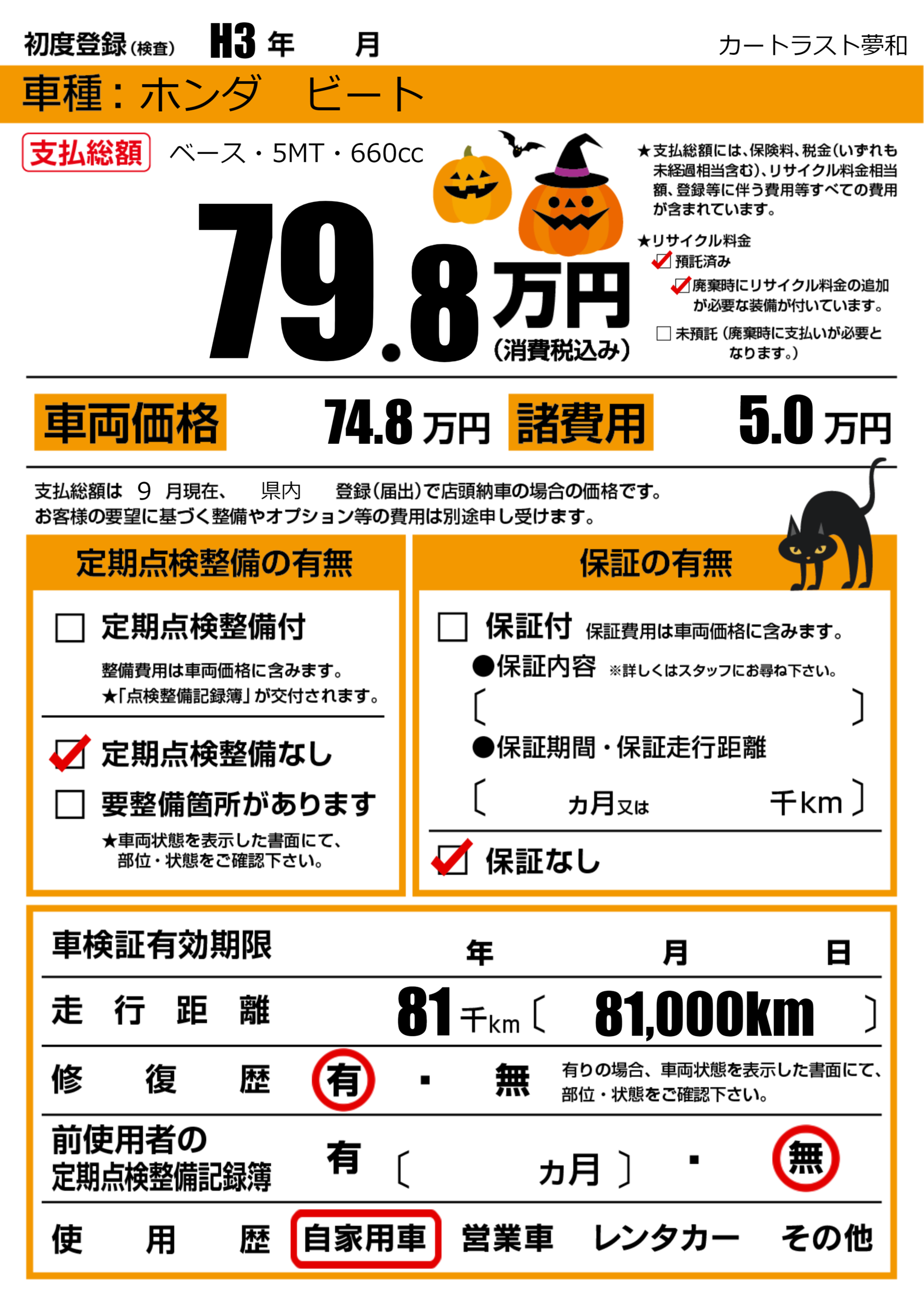 | 車名 | ホンダ ビート | グレード ミッション 排気量 |