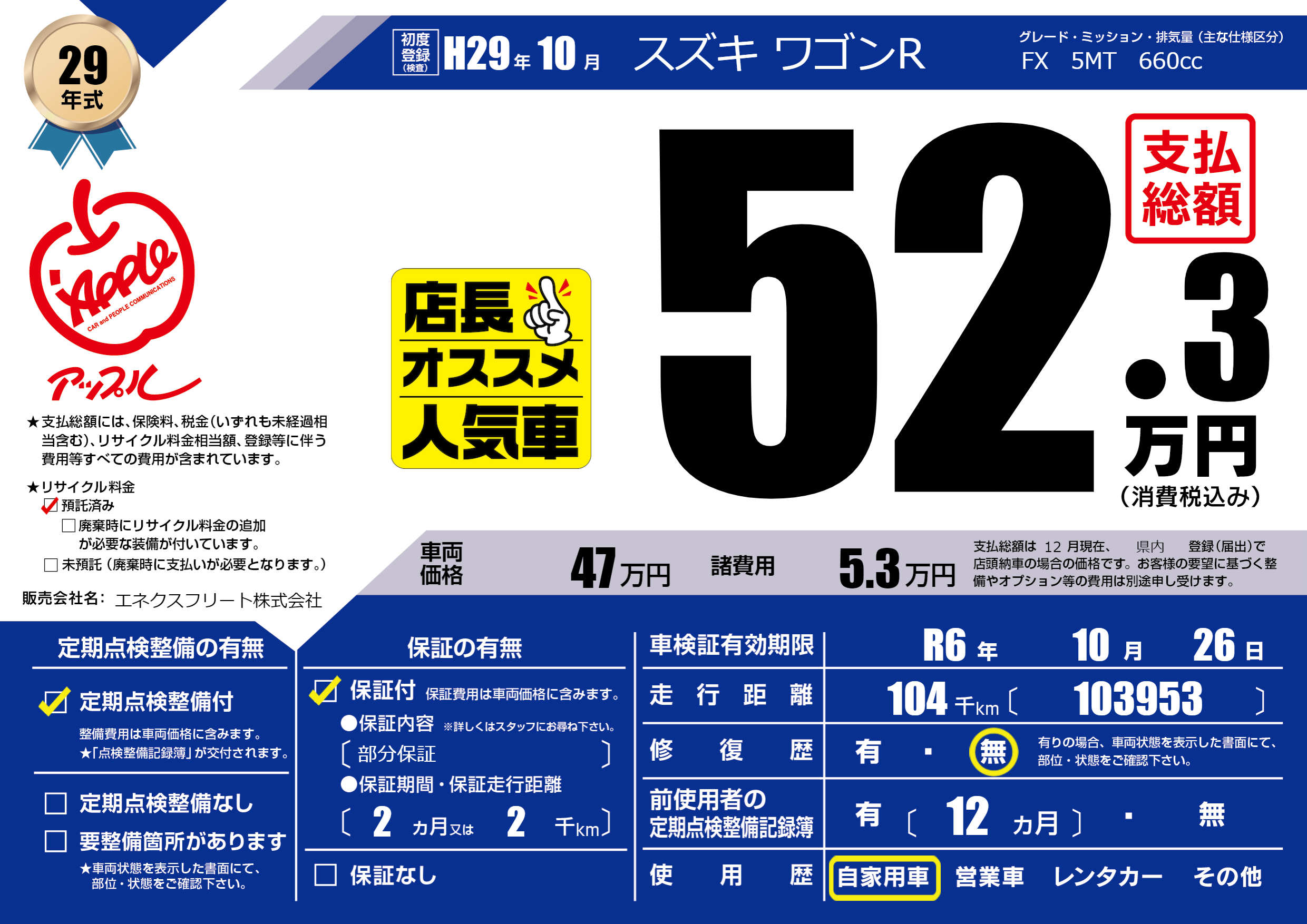 | 車名 | スズキ ワゴンR | グレード ミッション 排気量 |