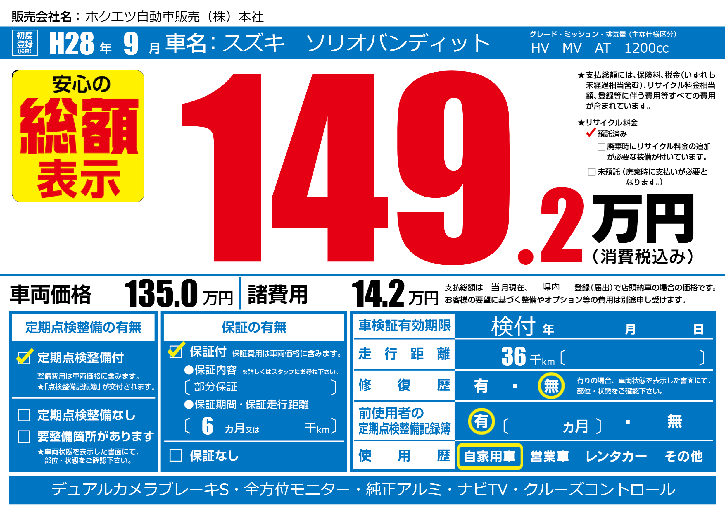 | 車名 | スズキ ソリオバンディット | グレード ミッション 排気量 |