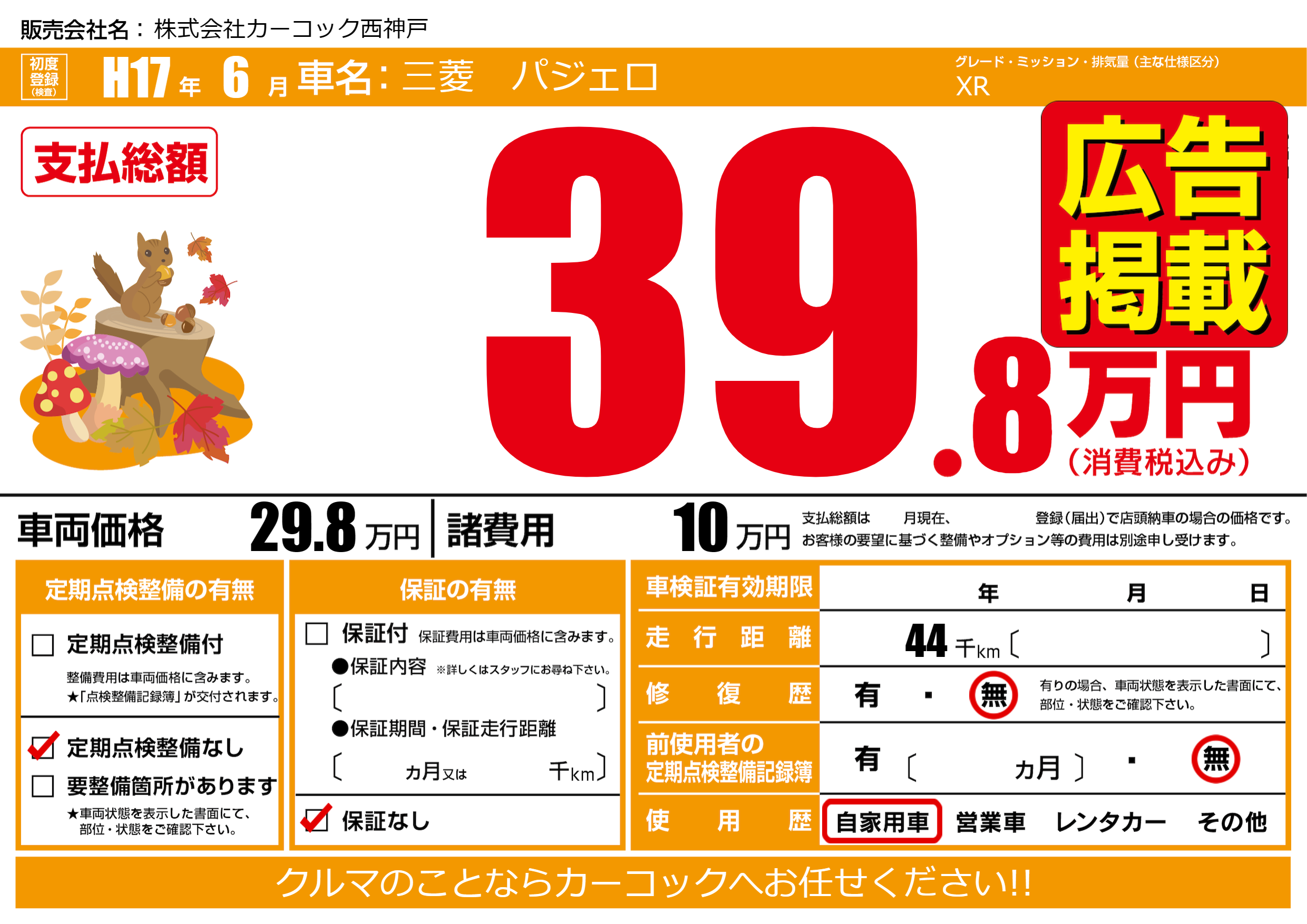 | 走行キロ | 4.4万km | 初年度登録 | H17年6月 |