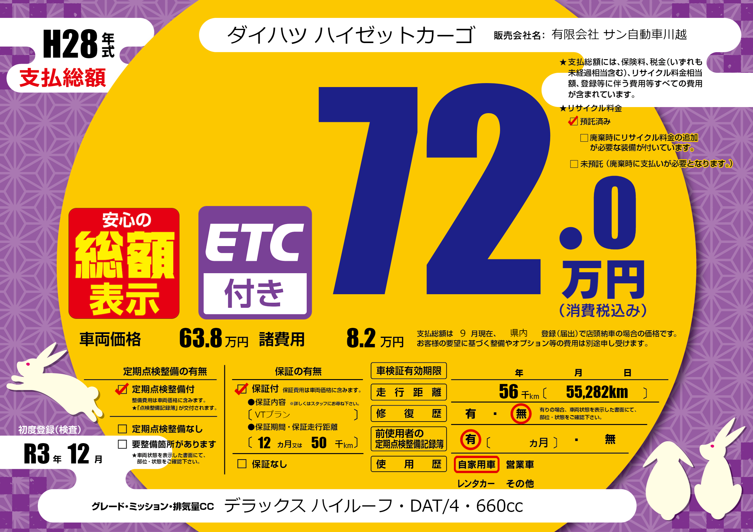 | 車名 | ダイハツ ハイゼットカーゴ | グレード ミッション 排気量 |