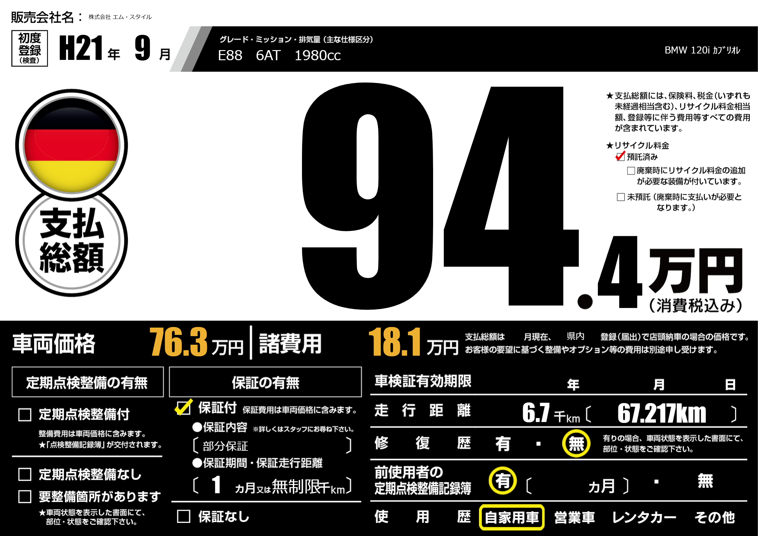 | 車名 | BMW 120i カブリオレ | グレード ミッション 排気量 |