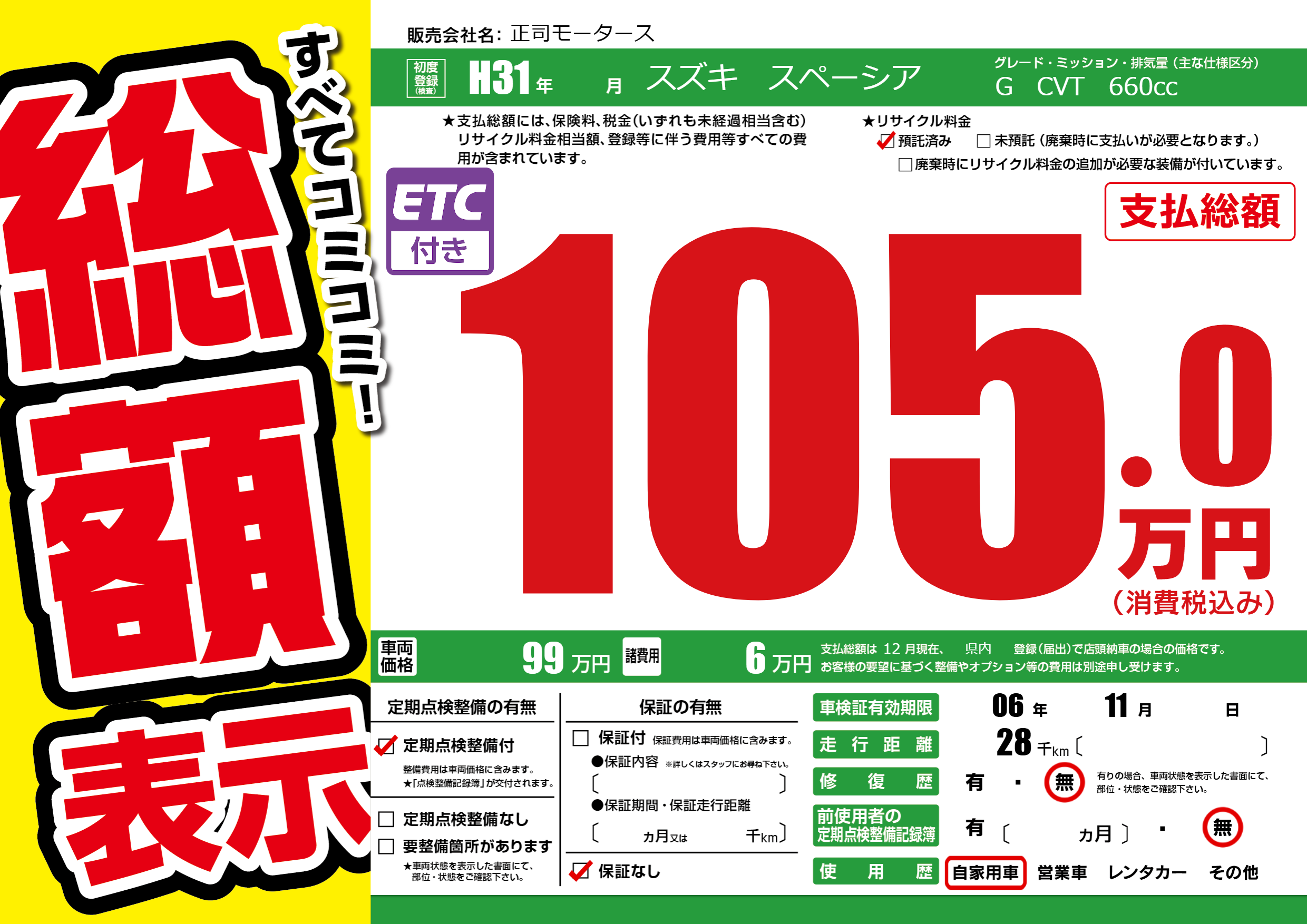 | 走行キロ | 2.8万km | 初年度登録 | H31年---月 |
