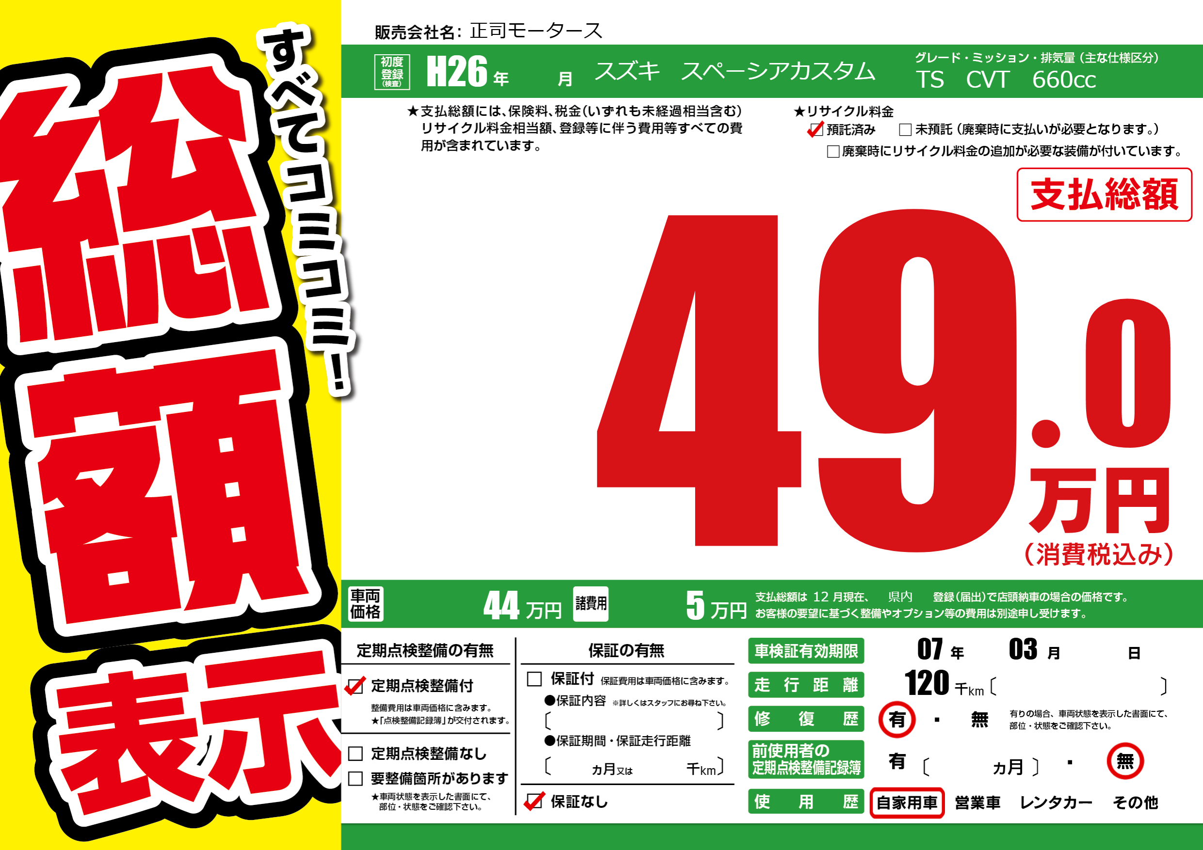 | 車名 | スズキ スペーシアカスタム | グレード ミッション 排気量 |