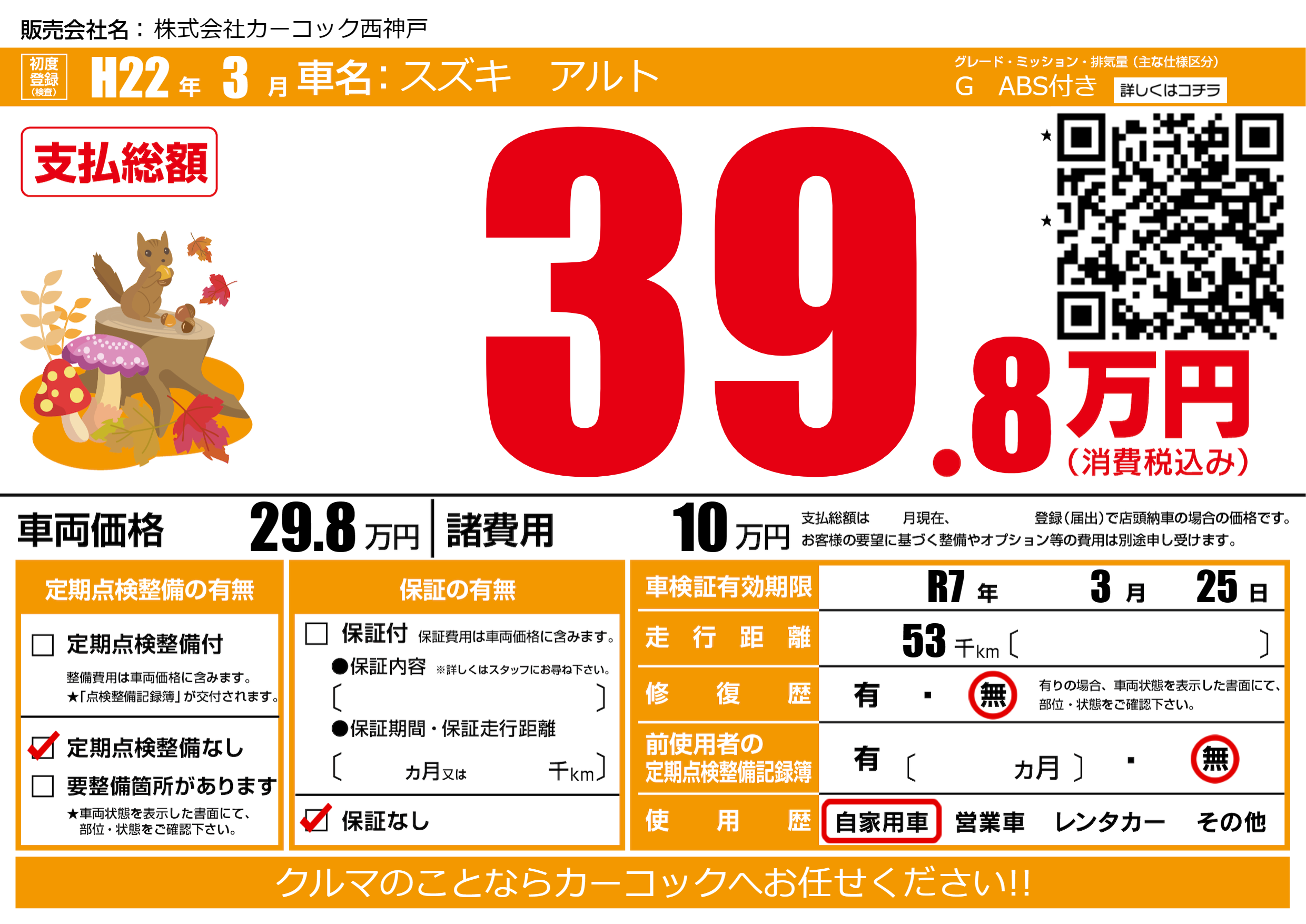 | 車名 | スズキ アルト | グレード ミッション 排気量 |