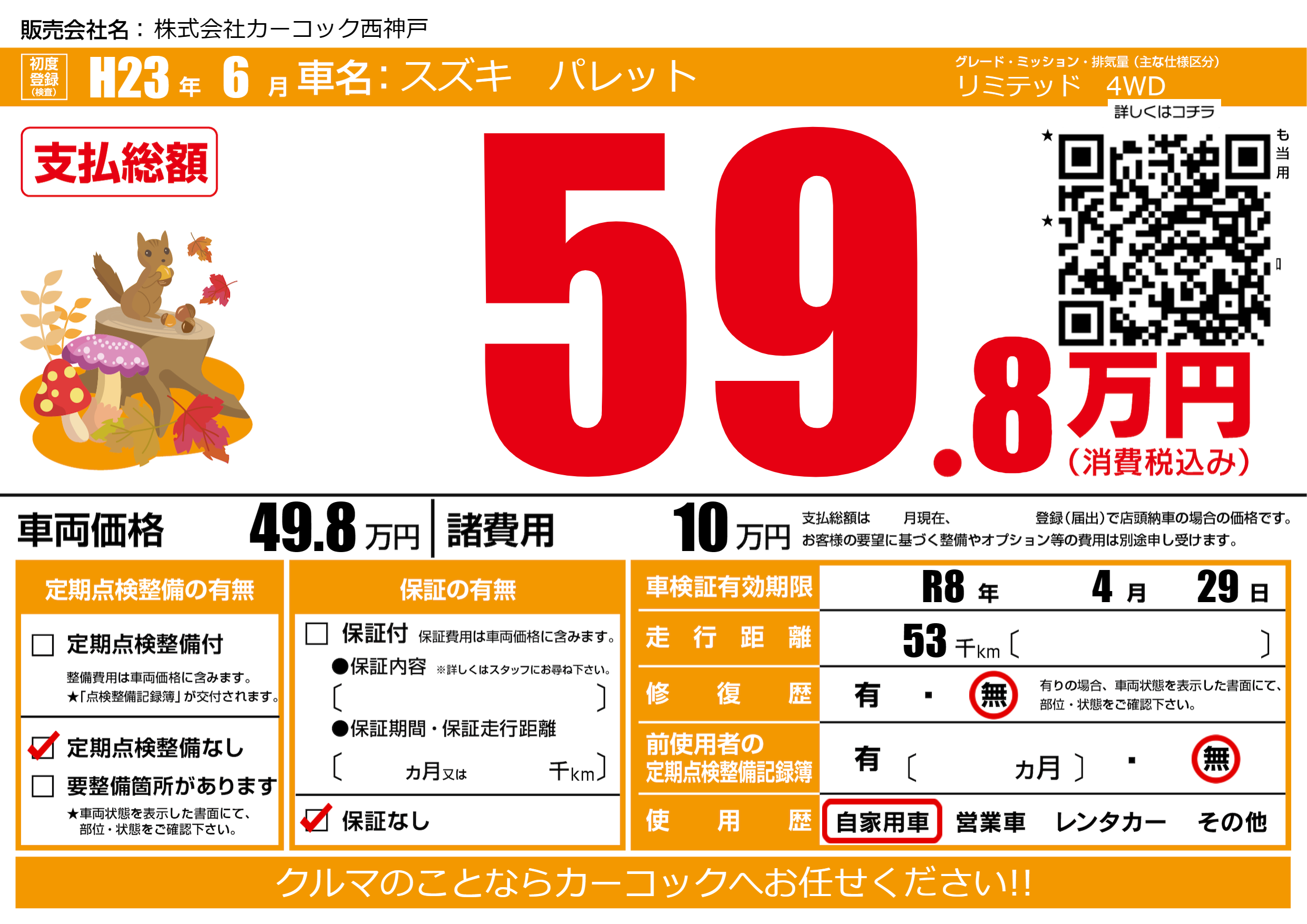 | 走行キロ | 5.3万km | 初年度登録 | H23年6月 |