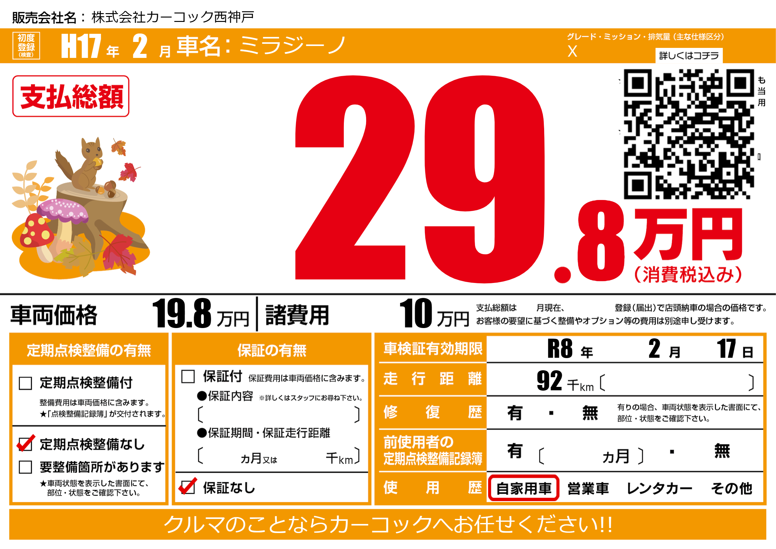 | 走行キロ | 9.2万km | 初年度登録 | H17年2月 |