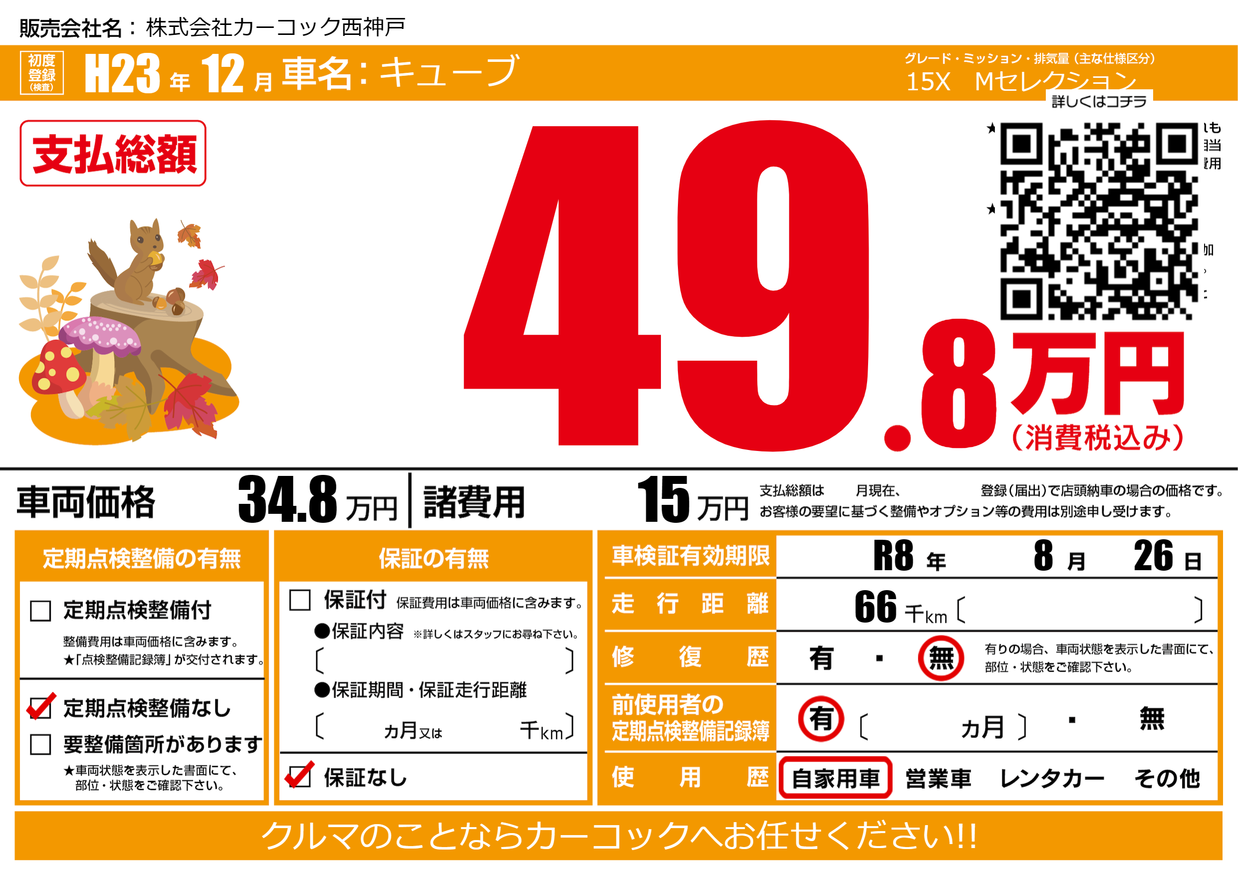 | 走行キロ | 6.6万km | 初年度登録 | H23年12月 |