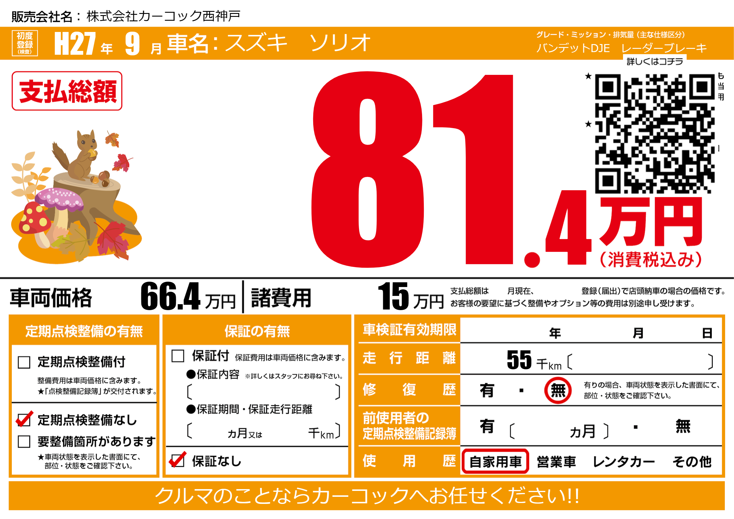 | 走行キロ | 5.5万km | 初年度登録 | H27年9月 |