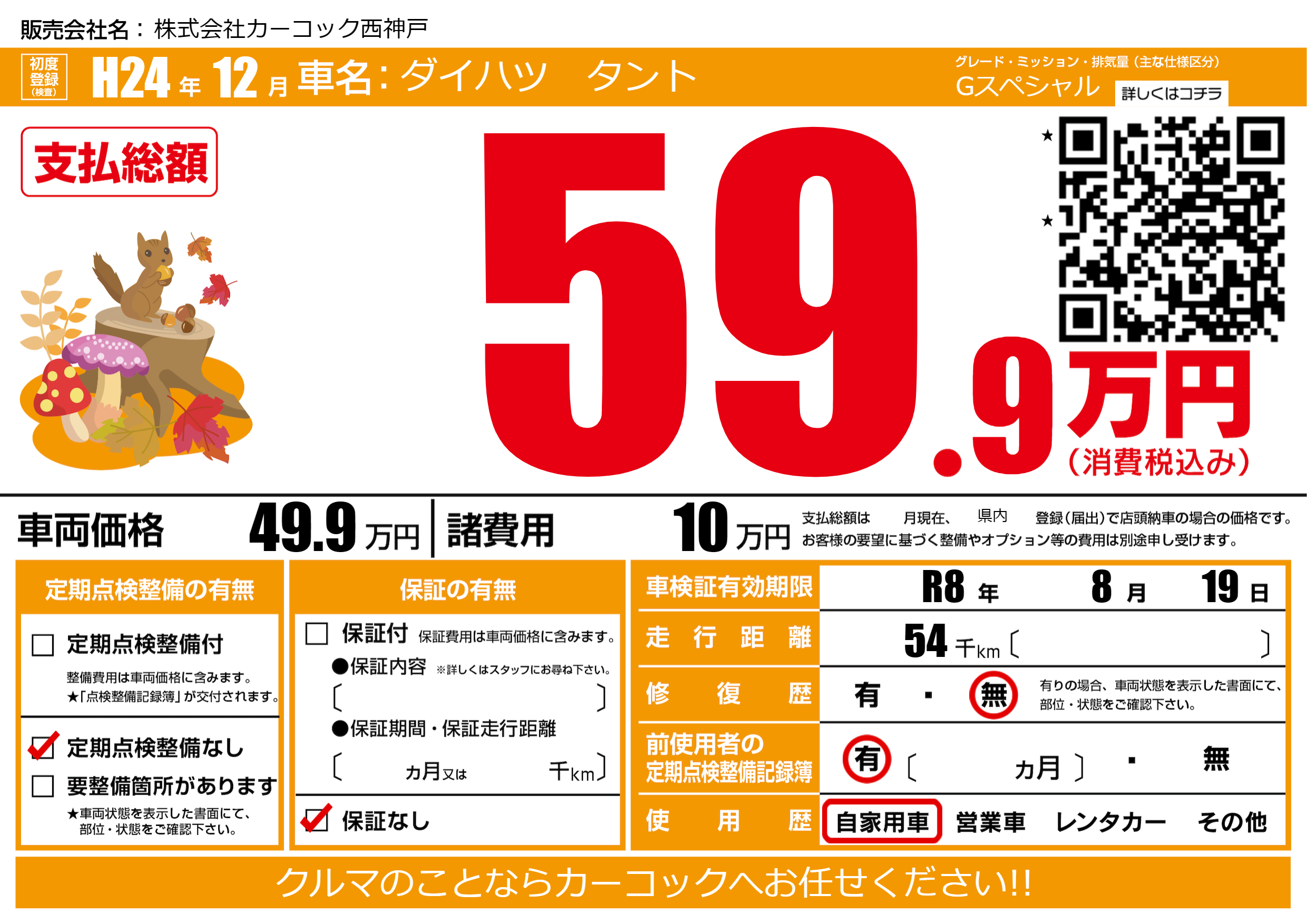 | 走行キロ | 5.4万km | 初年度登録 | H24年12月 |