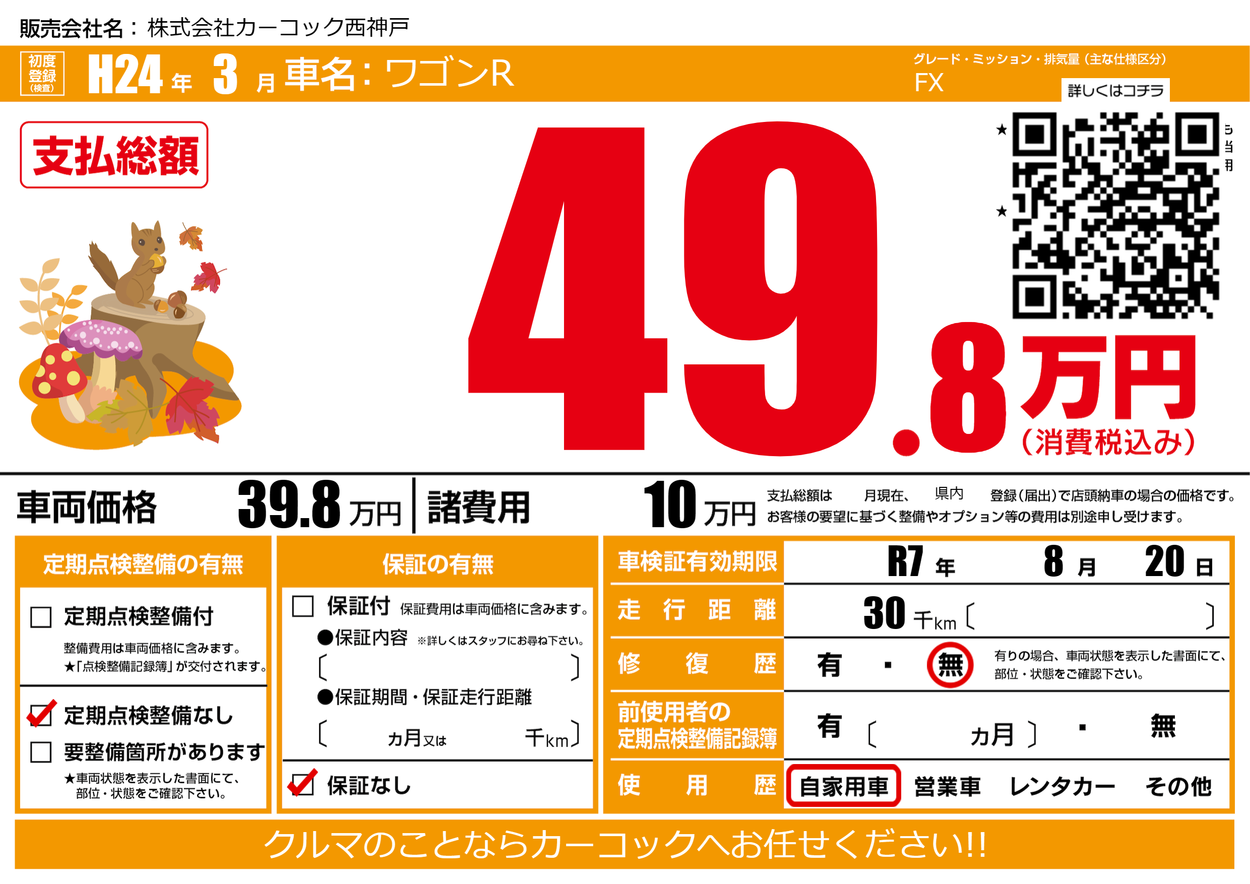 | 走行キロ | 3万km | 初年度登録 | H24年3月 |