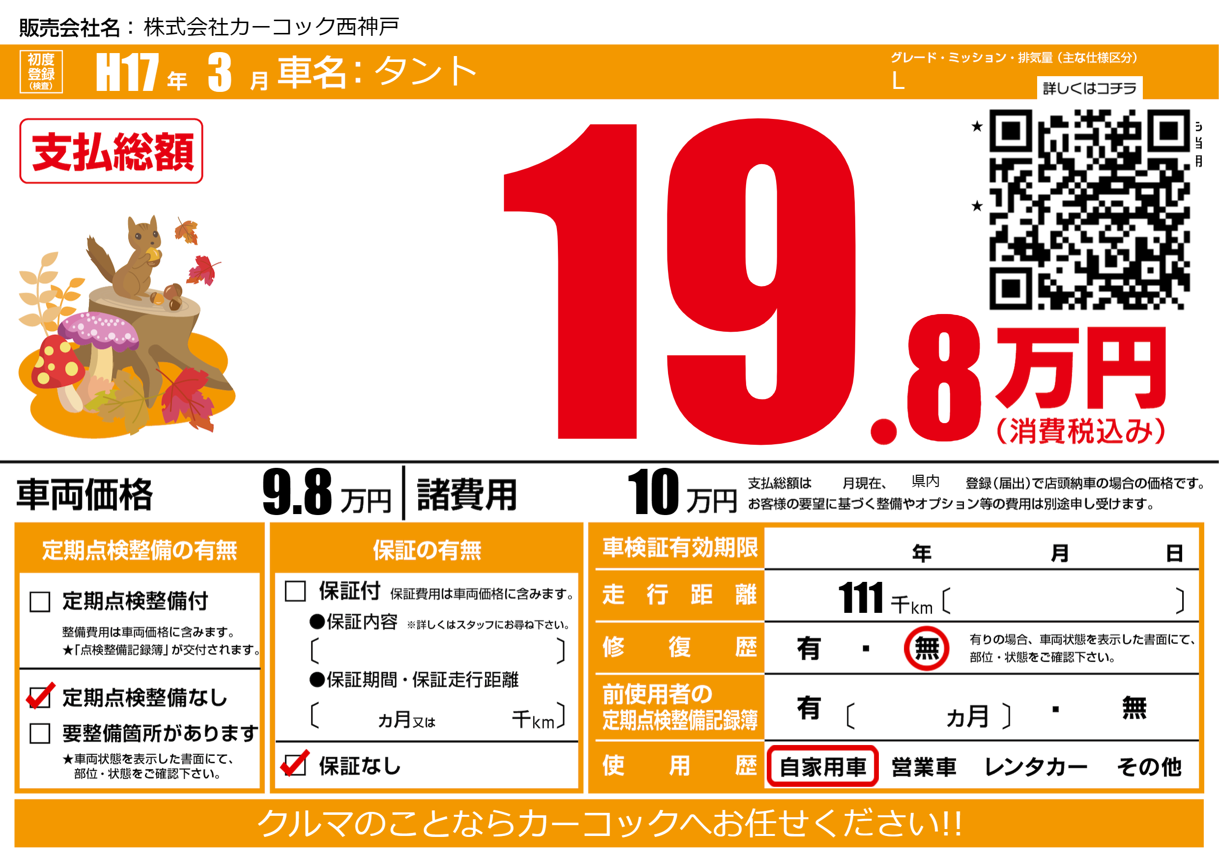| 走行キロ | 11.1万km | 初年度登録 | H17年3月 |