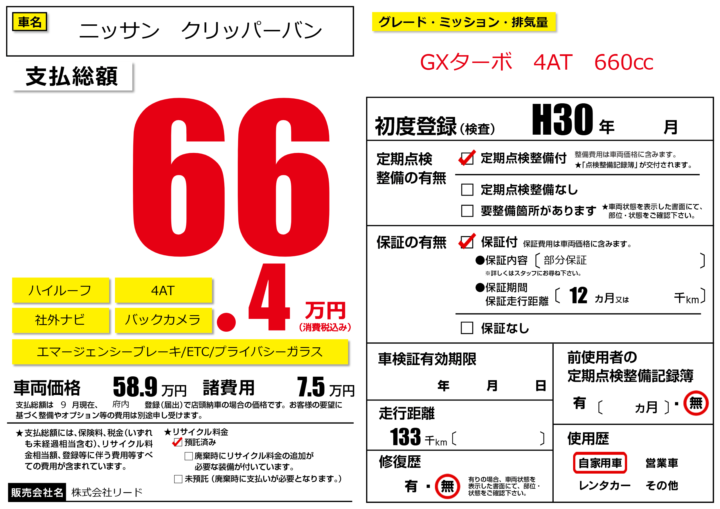 | 車名 | ニッサン クリッパーバン | グレード ミッション 排気量 |