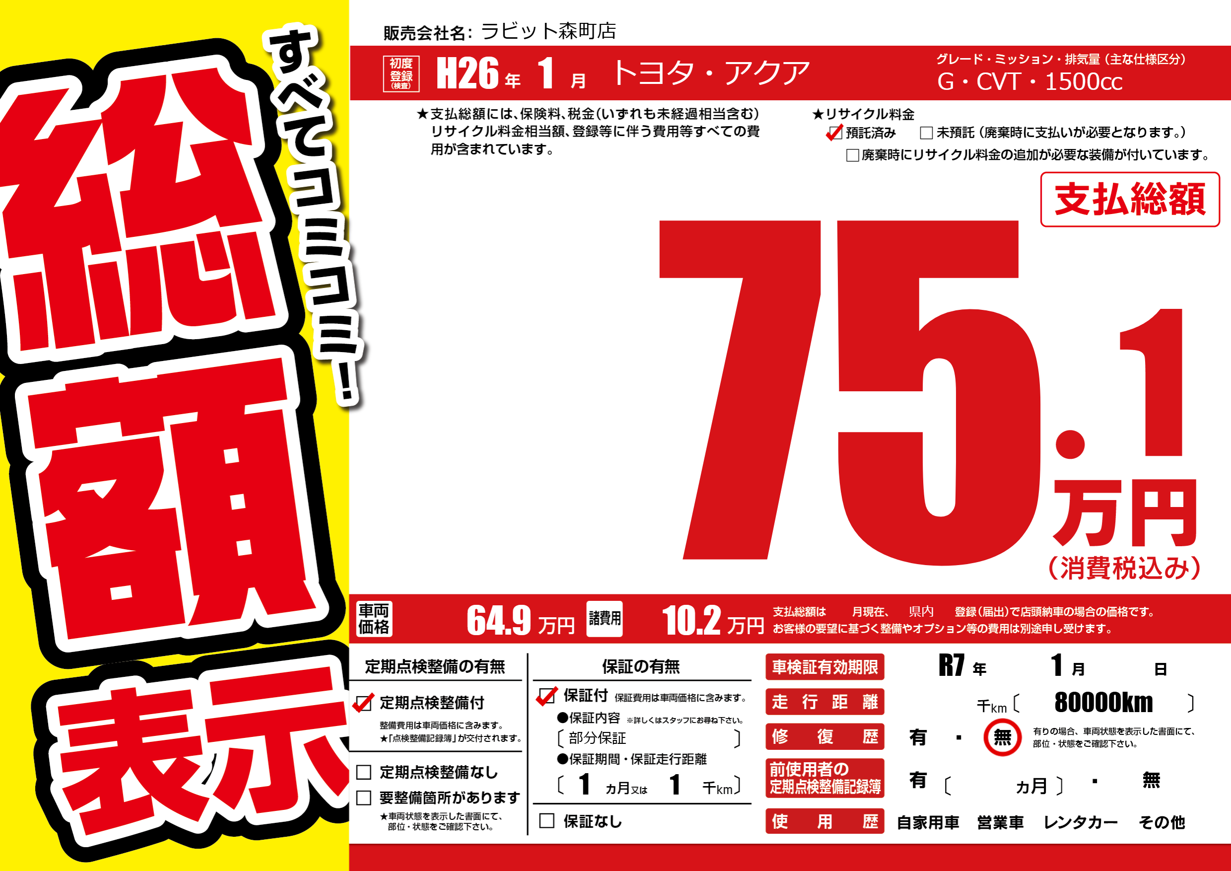 あり | リサイクル預託金相当額 | ( 0円)が別途必要 |