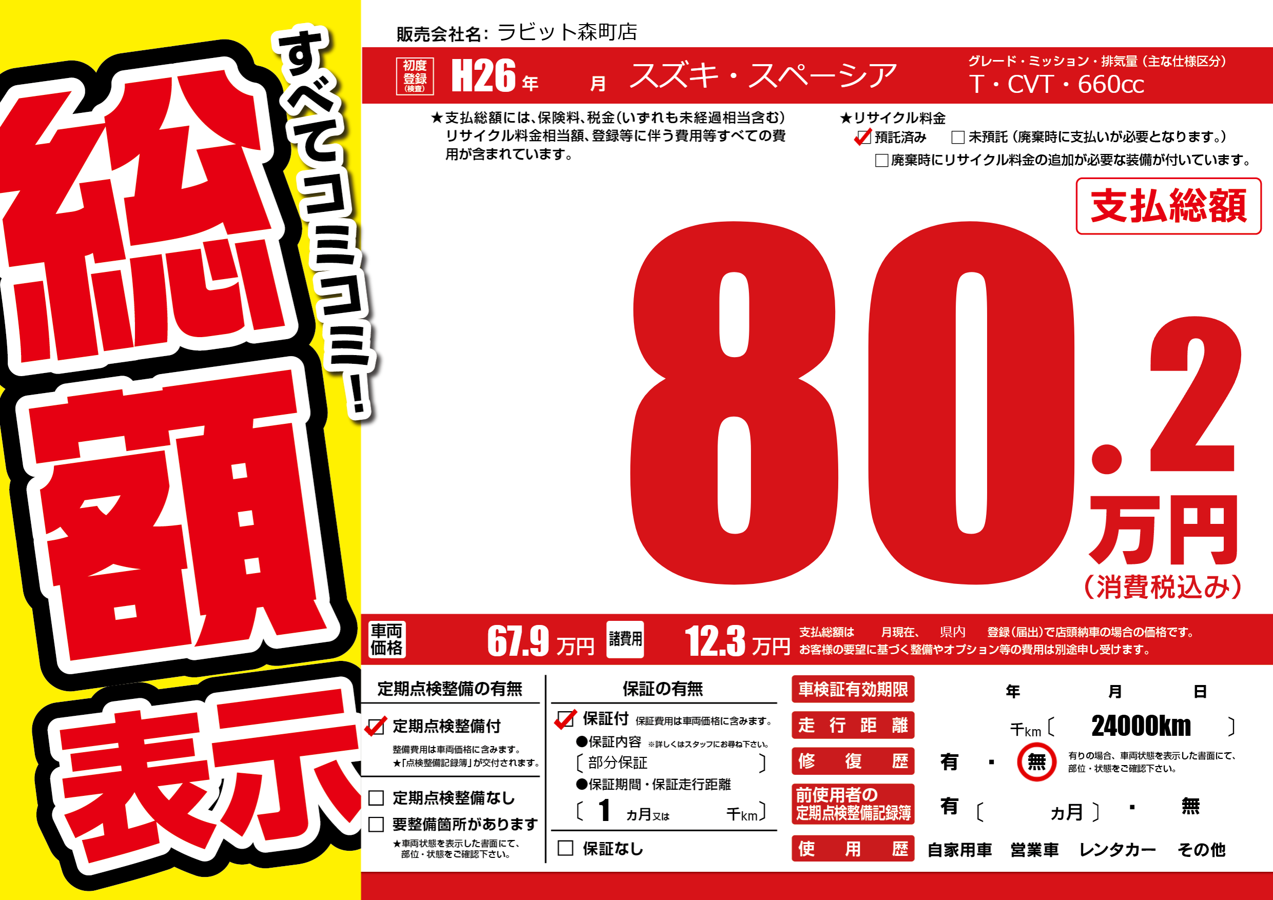 | 車名 | スズキ・スペーシア | グレード ミッション 排気量 |