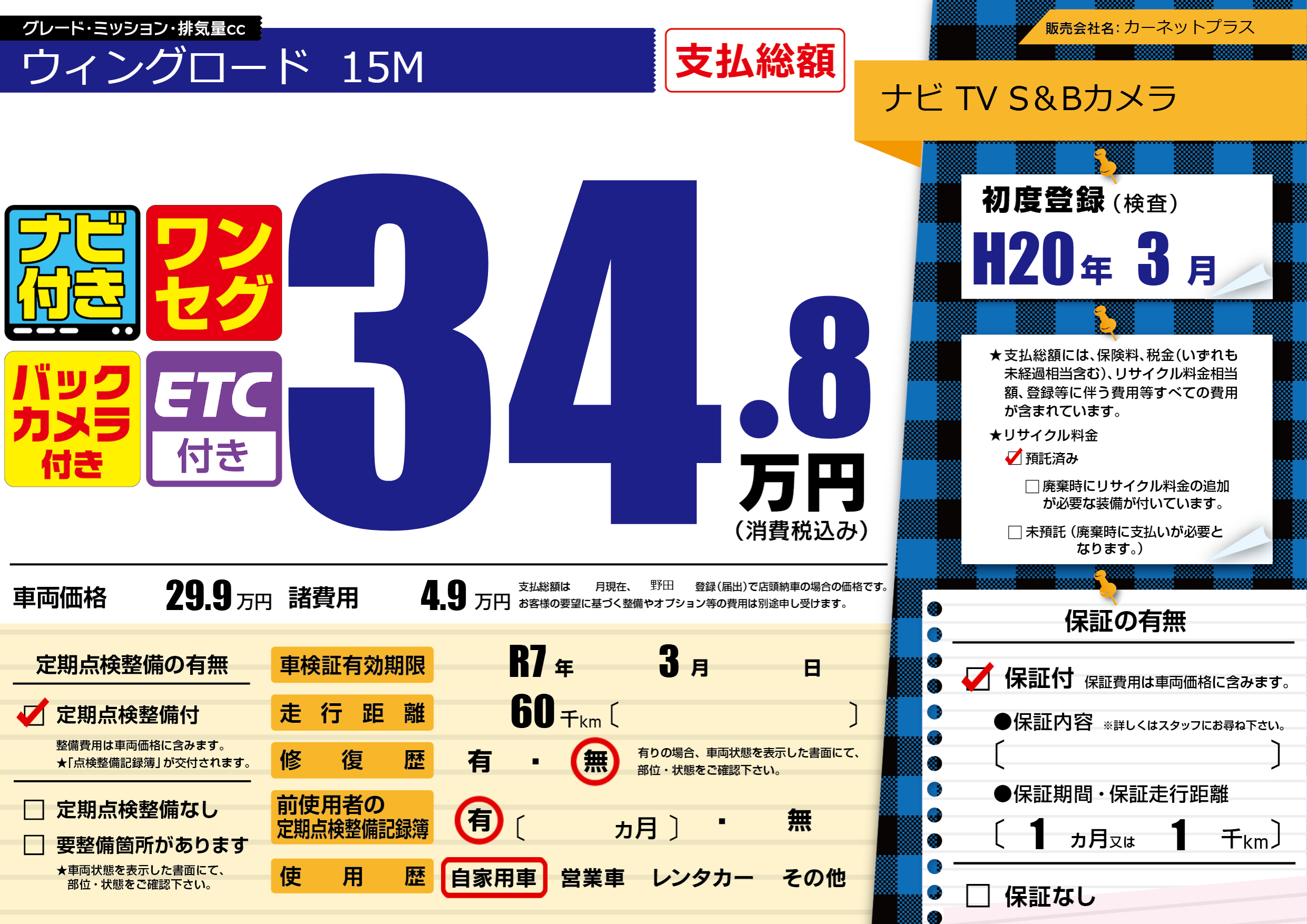 保証付き 保証内容(---) 1ヶ月または(1)千kmまで |
