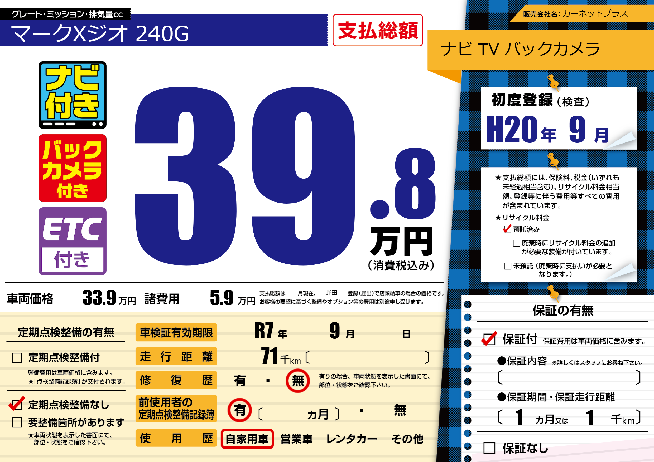 | 走行キロ | 7.1万km | 初年度登録 | H20年9月 |