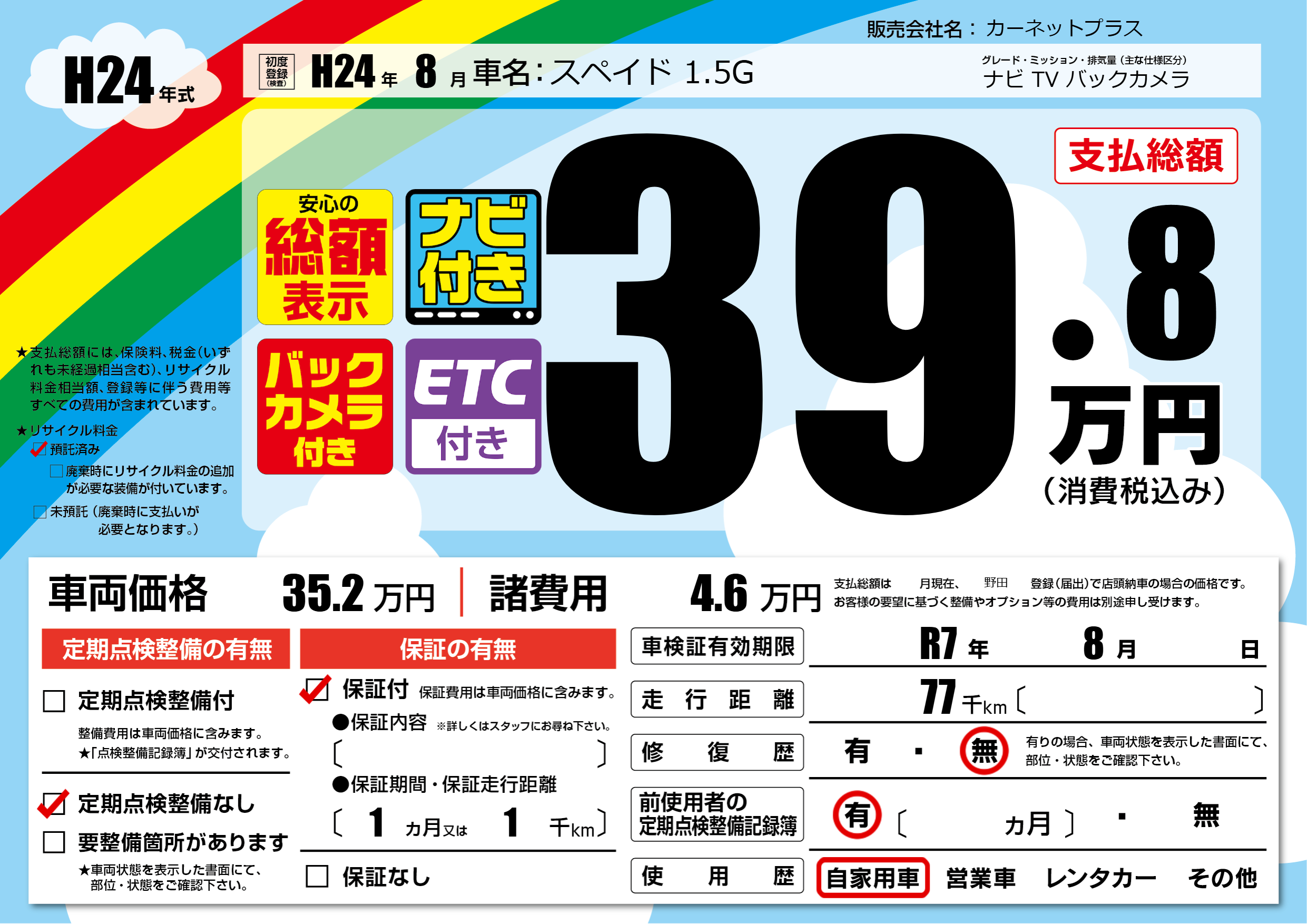 | 車名 | スペイド 1.5G | グレード ミッション 排気量 |