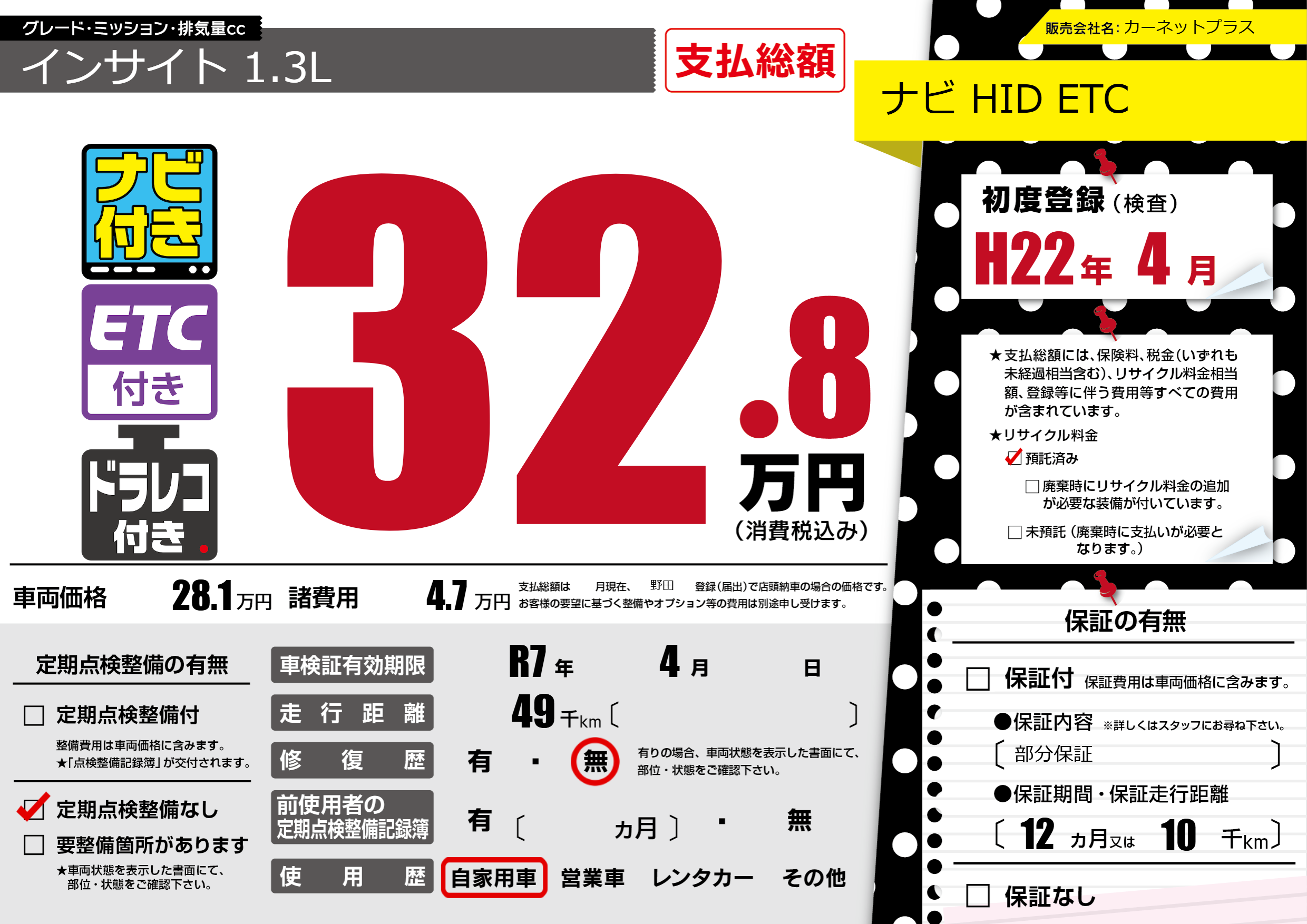 | 走行キロ | 4.9万km | 初年度登録 | H22年4月 |