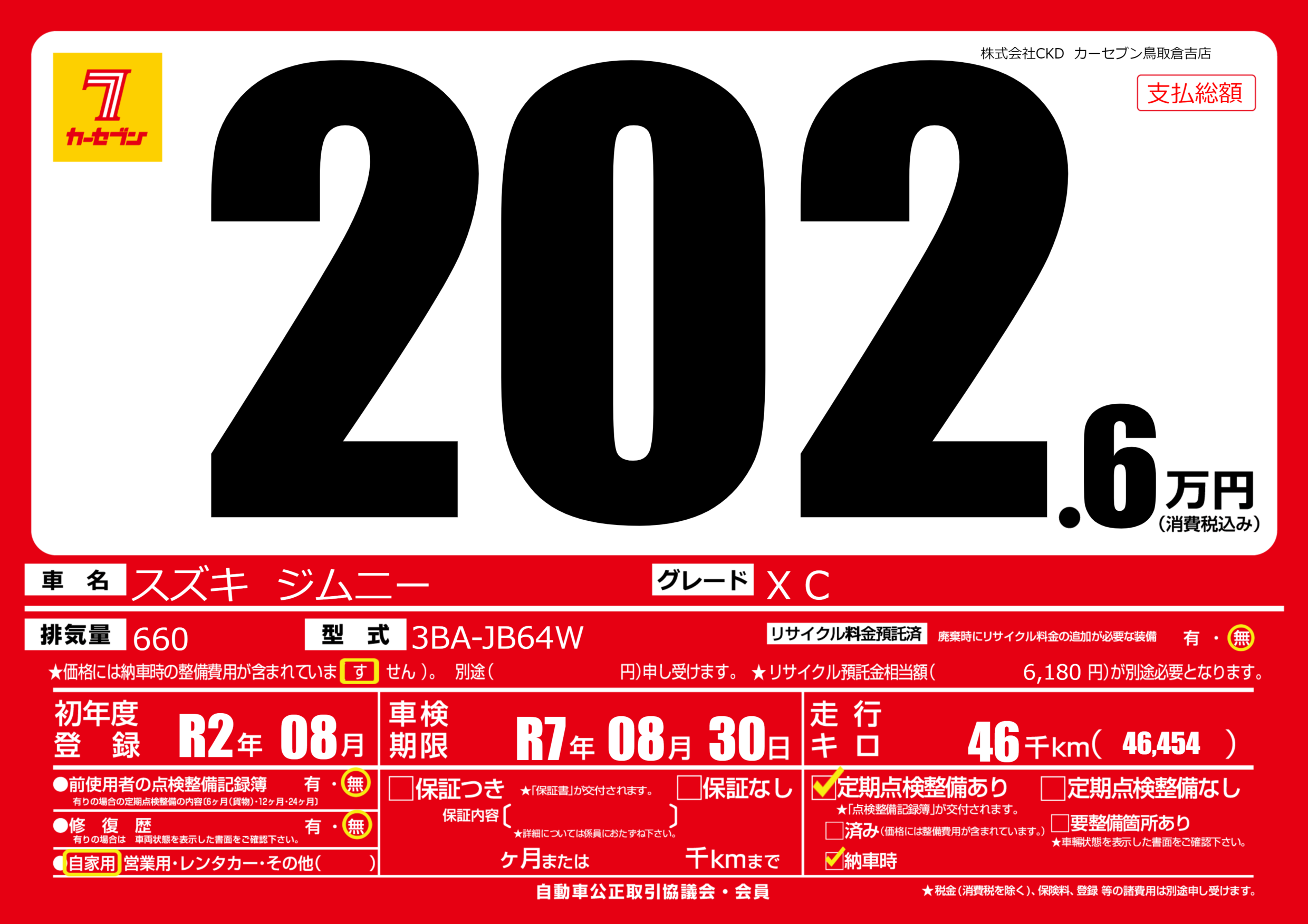 | 走行キロ | 4.6万km | 初年度登録 | R2年08月 |
