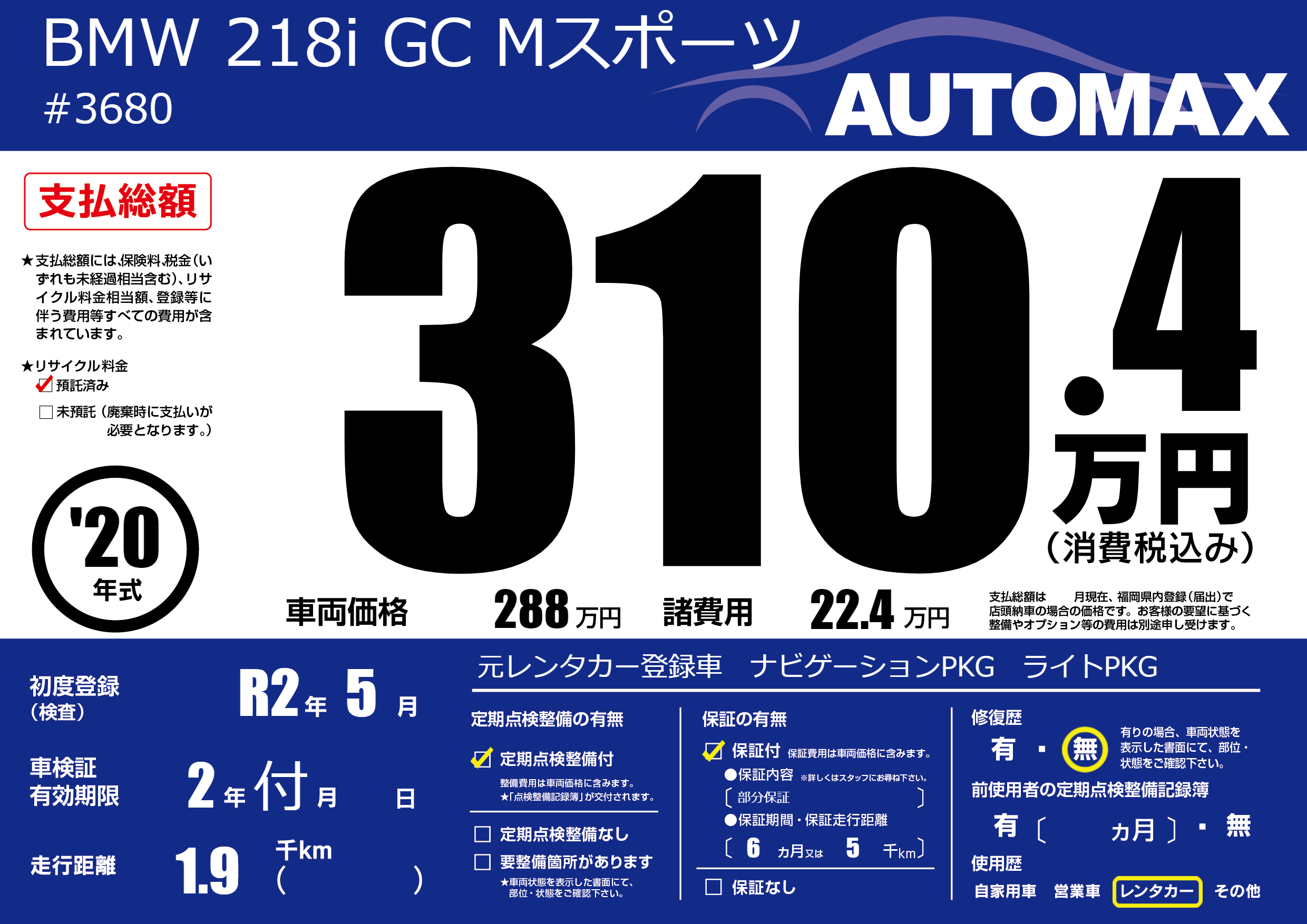 | 車名 | BMW 218i GC Mスポーツ | グレード ミッション 排気量 |