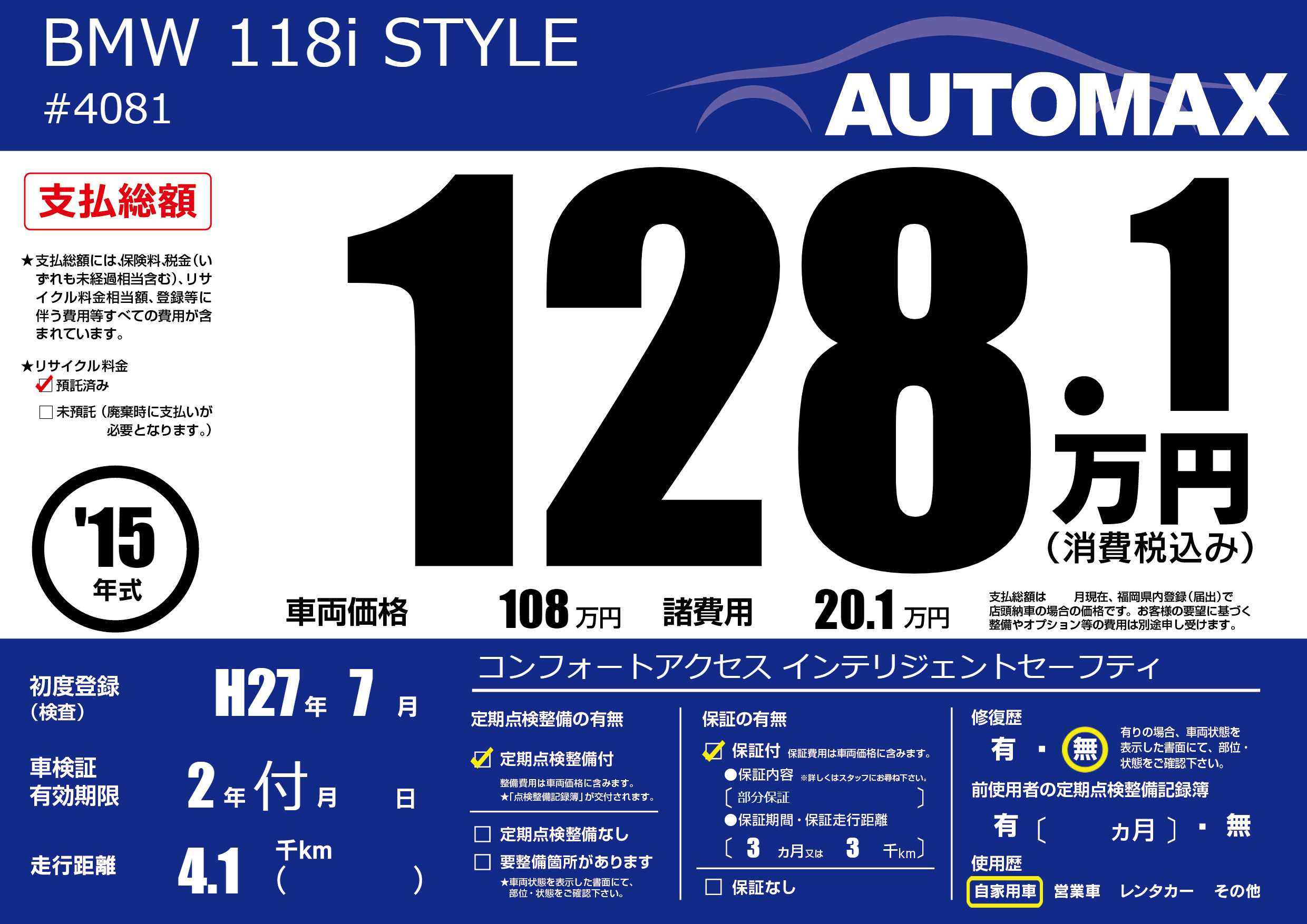 | 車名 | BMW 118i STYLE | グレード ミッション 排気量 |