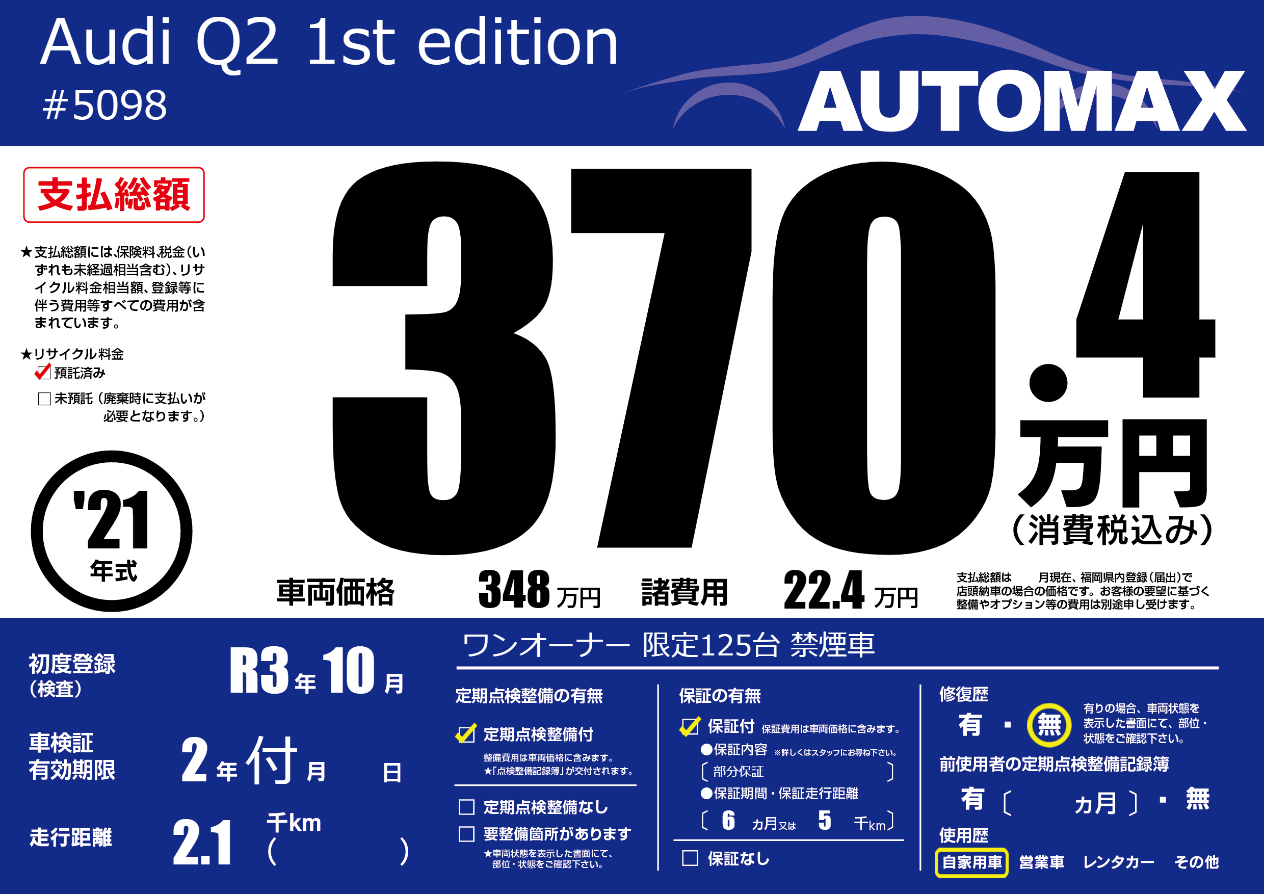 | 車名 | Audi Q2 1st edition | グレード ミッション 排気量 |