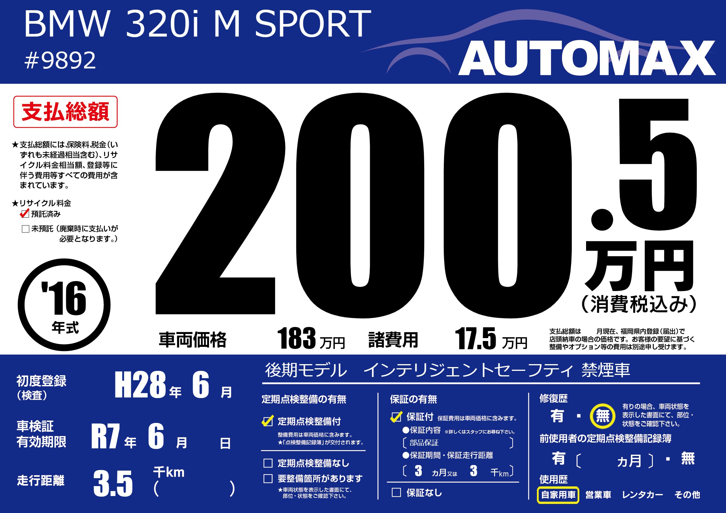 | 車名 | BMW 320i M SPORT | グレード ミッション 排気量 |