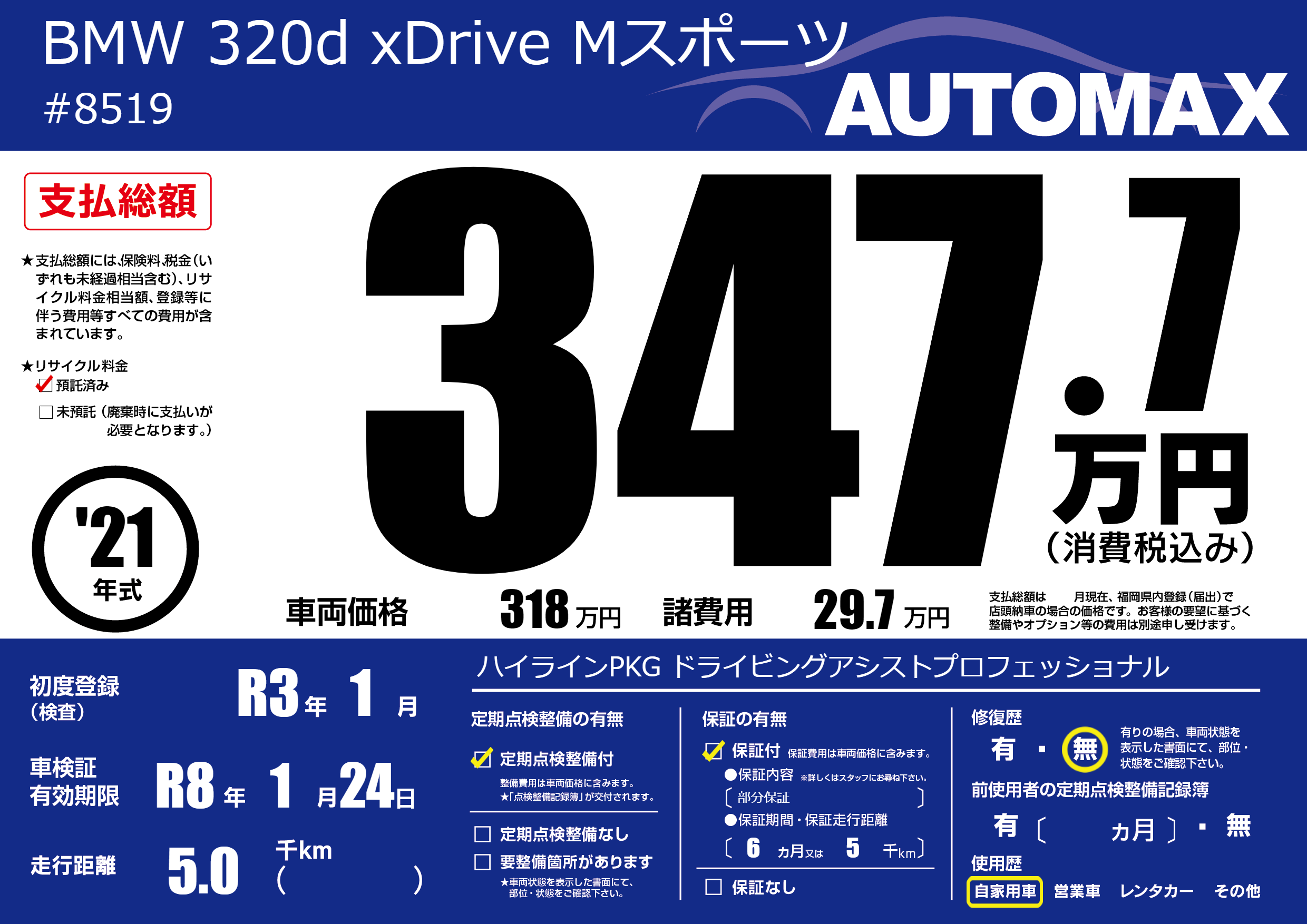 | 車名 | BMW 320d xDrive Mスポーツ | グレード ミッション 排気量 |