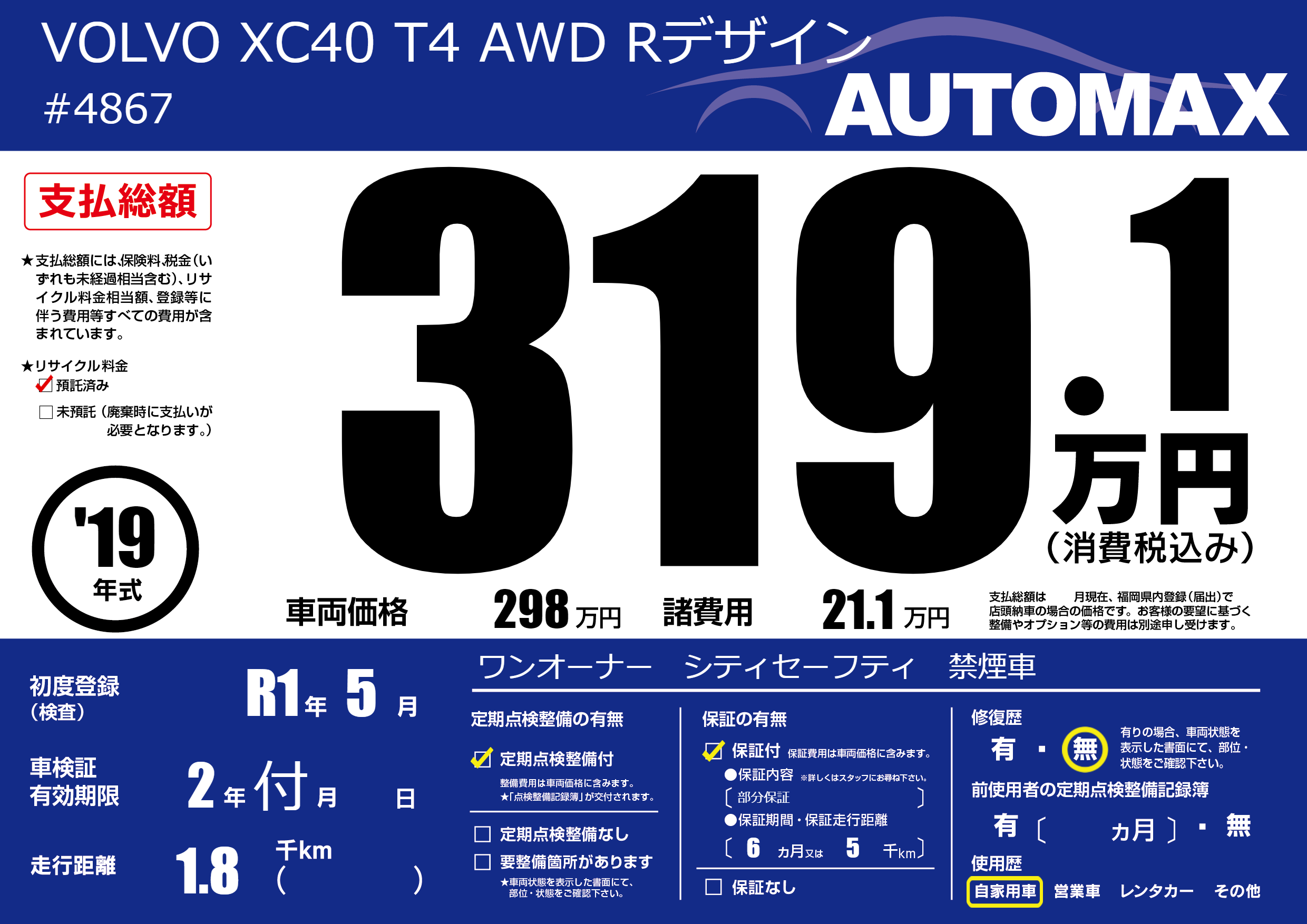 | 車名 | VOLVO XC40 T4 AWD Rデザイン | グレード ミッション 排気量 |