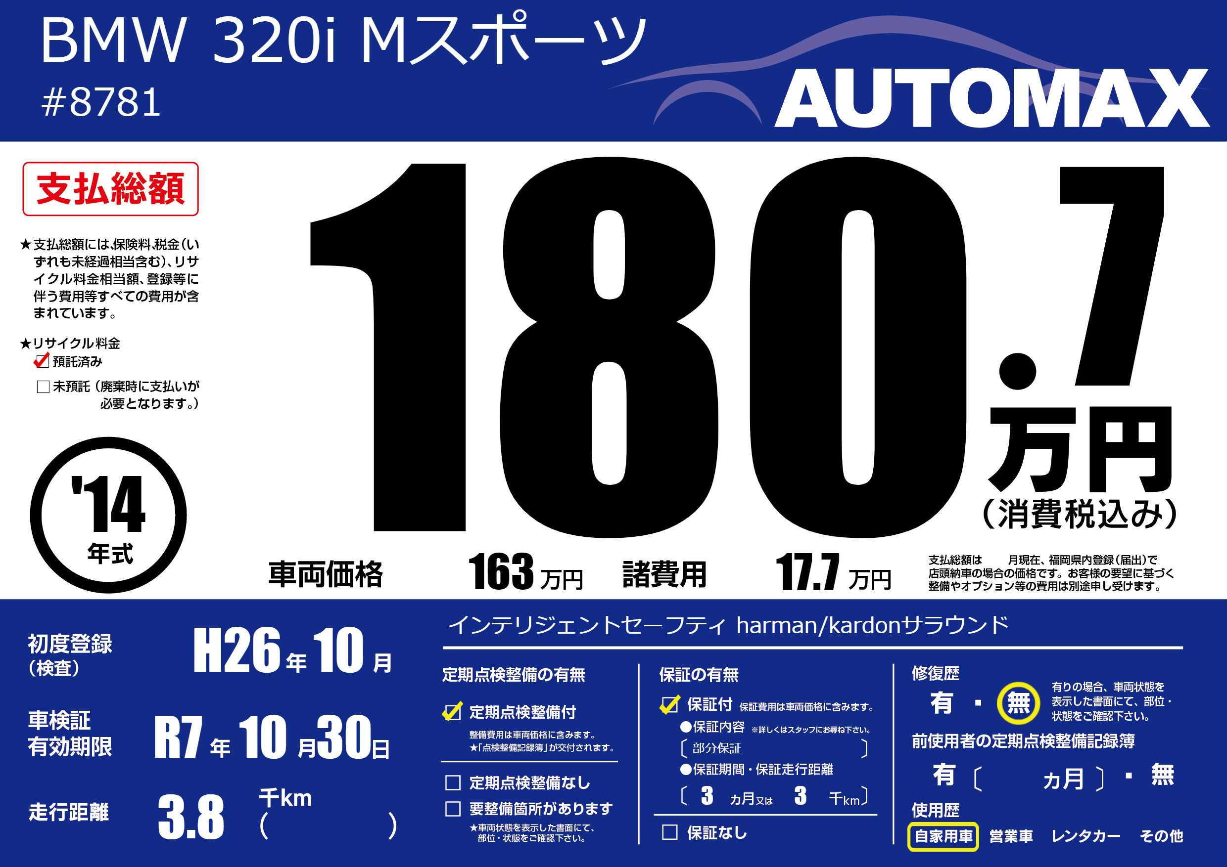 | 車名 | BMW 320i Mスポーツ | グレード ミッション 排気量 |