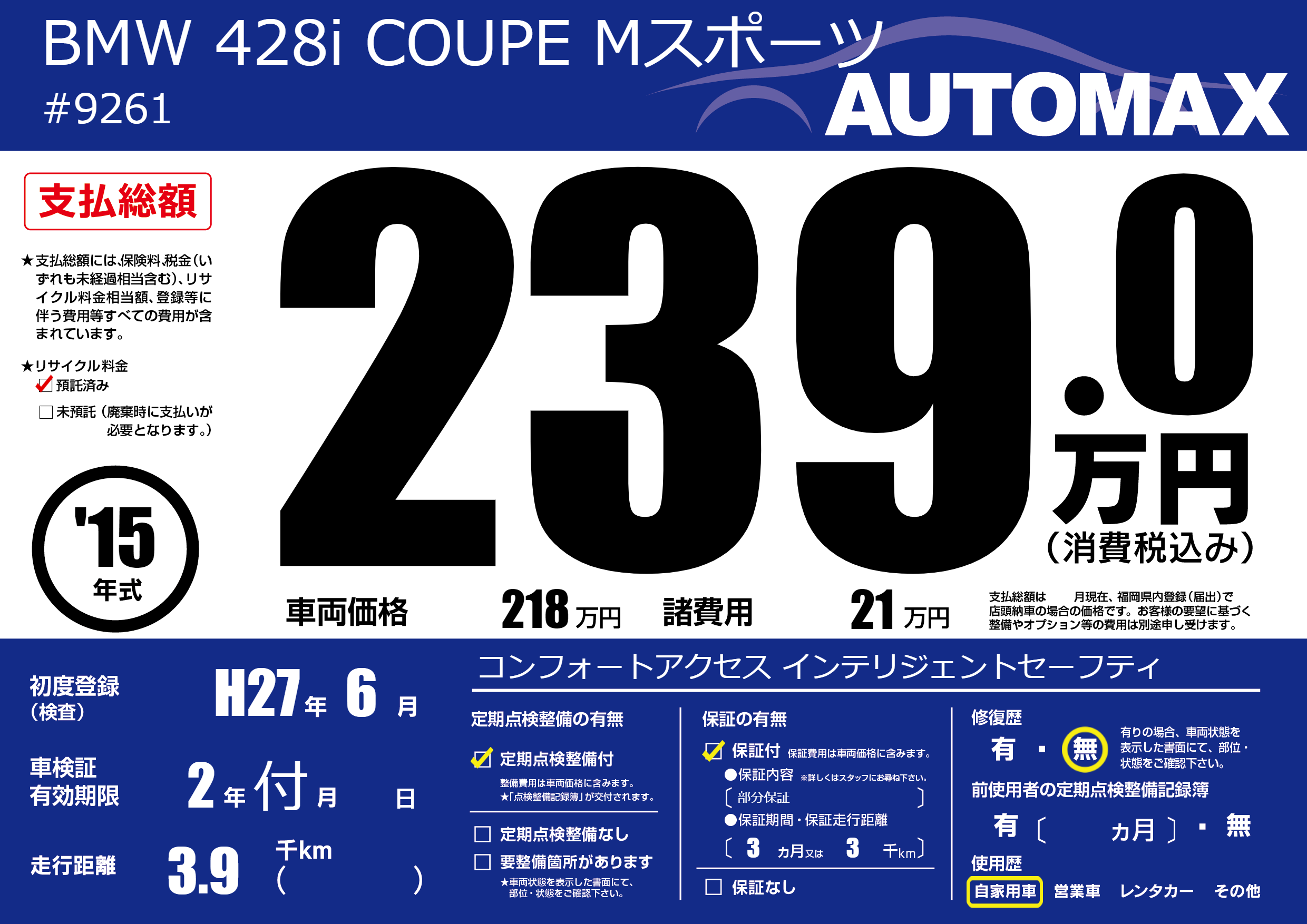 | 車名 | BMW 428i COUPE Mスポーツ | グレード ミッション 排気量 |