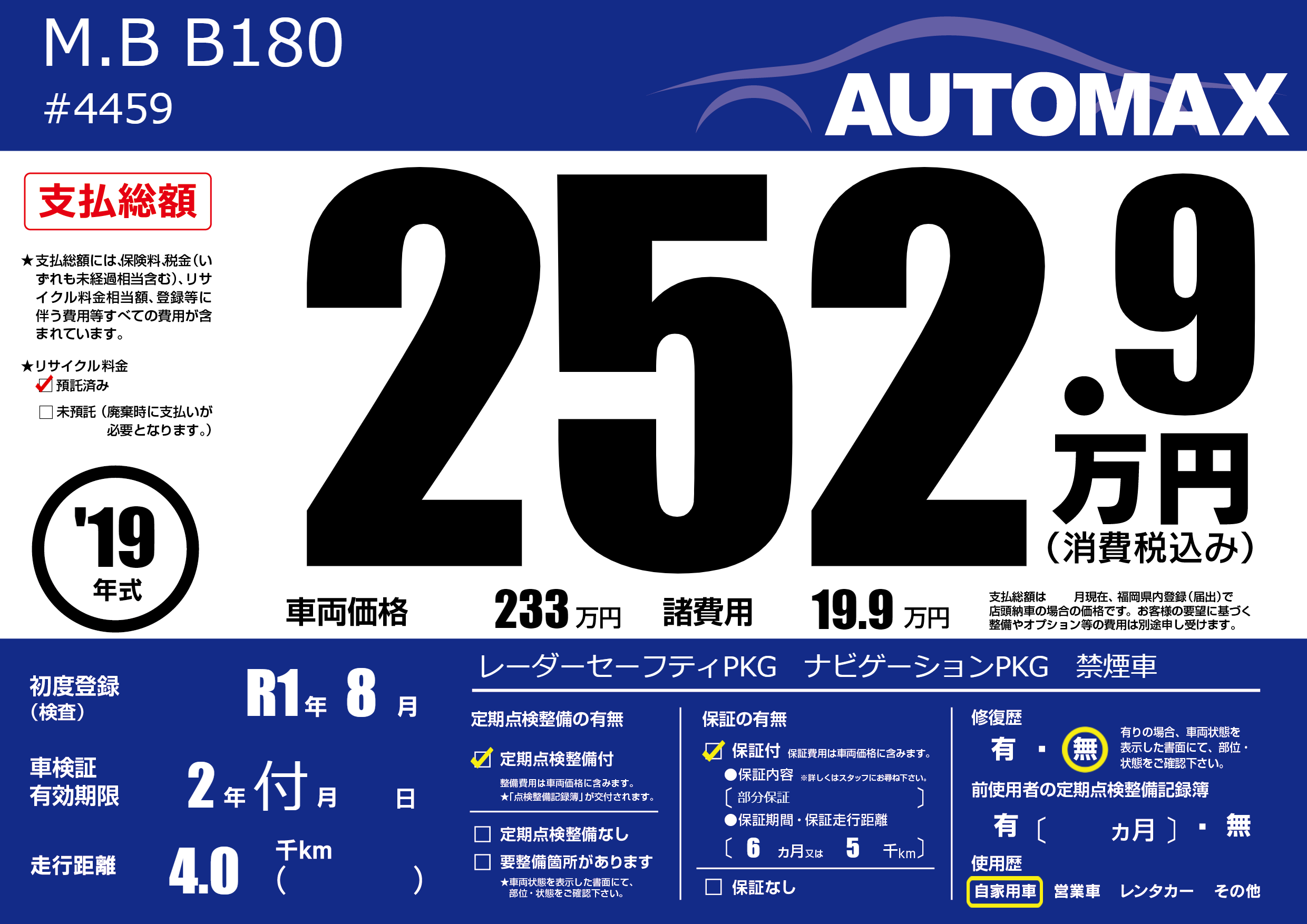 | 車名 | M.B B180 | グレード ミッション 排気量 |