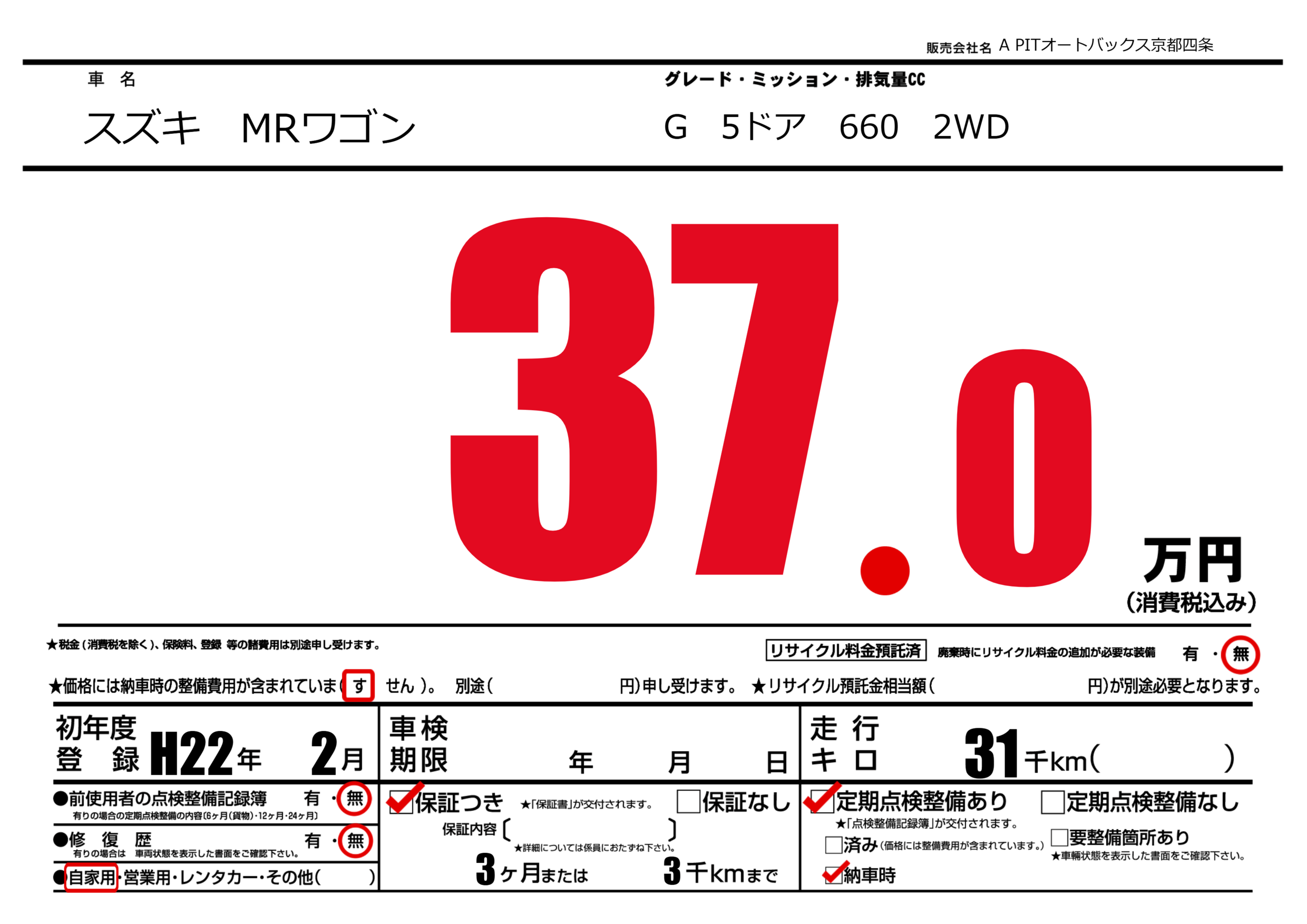 | 車名 | スズキ MRワゴン | グレード ミッション 排気量 |