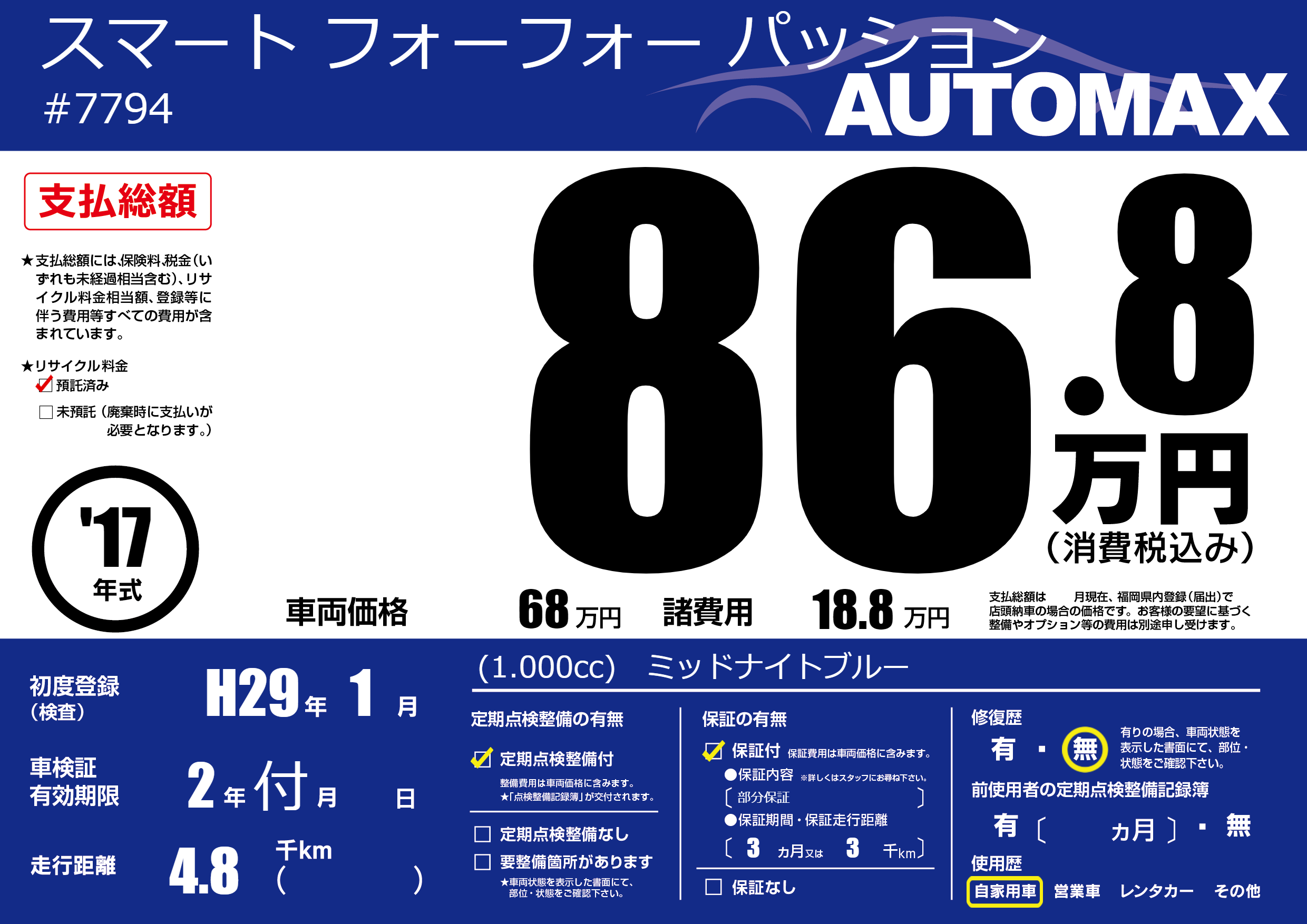 | 車名 | スマート フォーフォー パッション | グレード ミッション 排気量 |