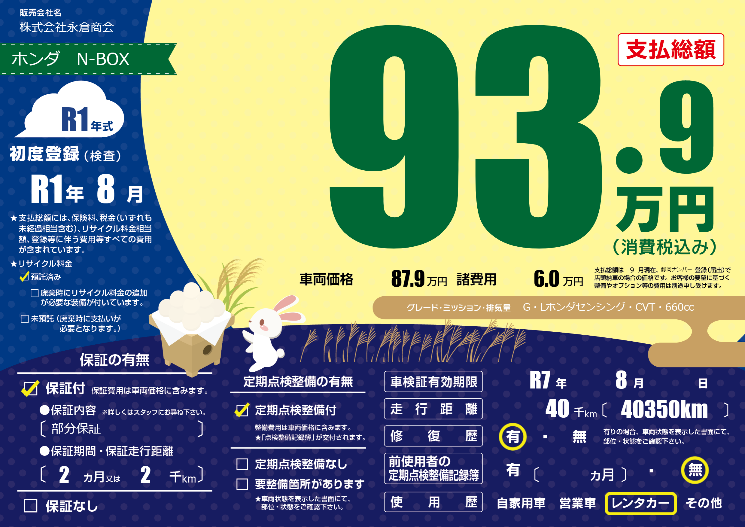 | 車名 | ホンダ N-BOX | グレード ミッション 排気量 |