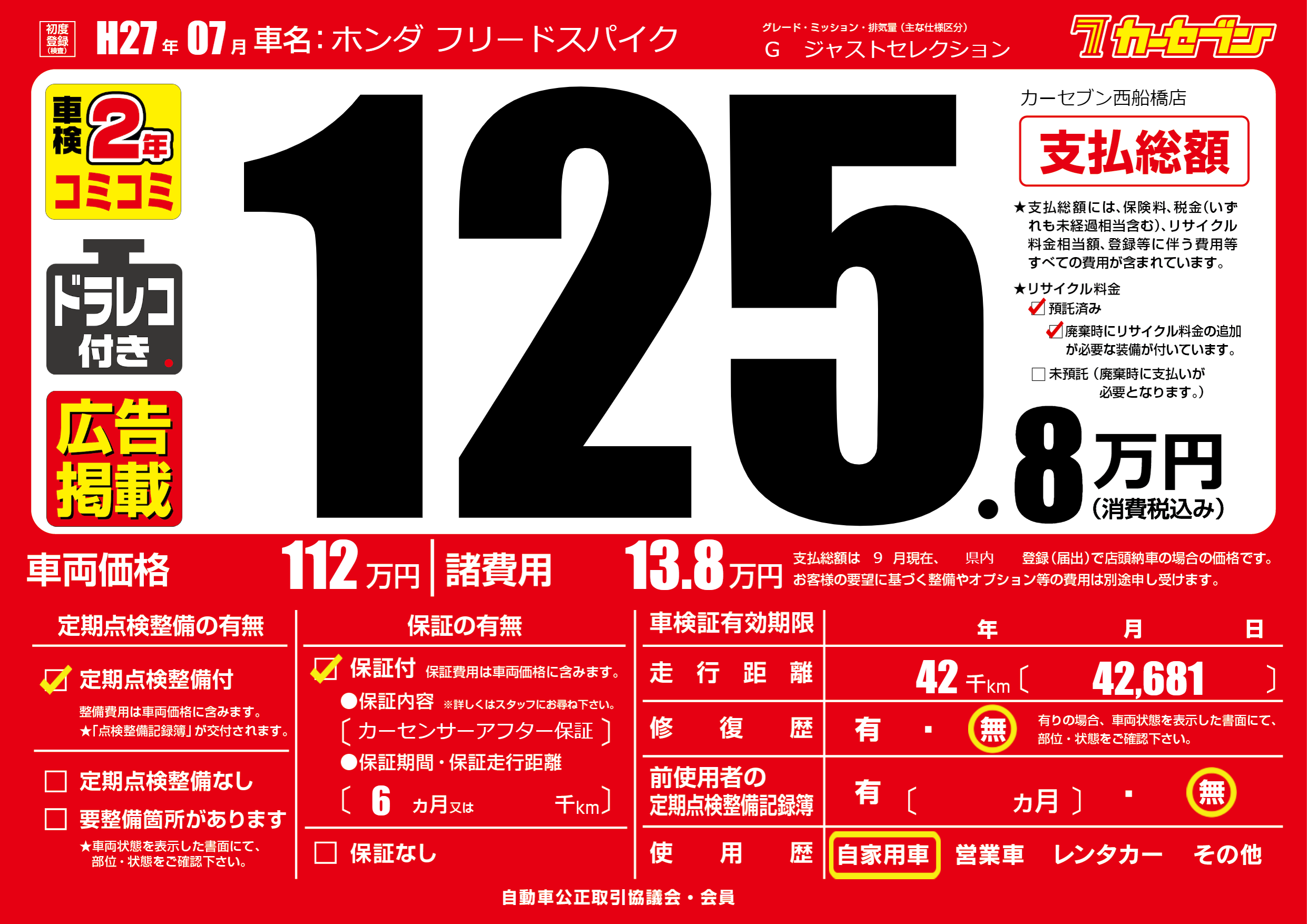 | 走行キロ | 4.2万km | 初年度登録 | H27年07月 |
