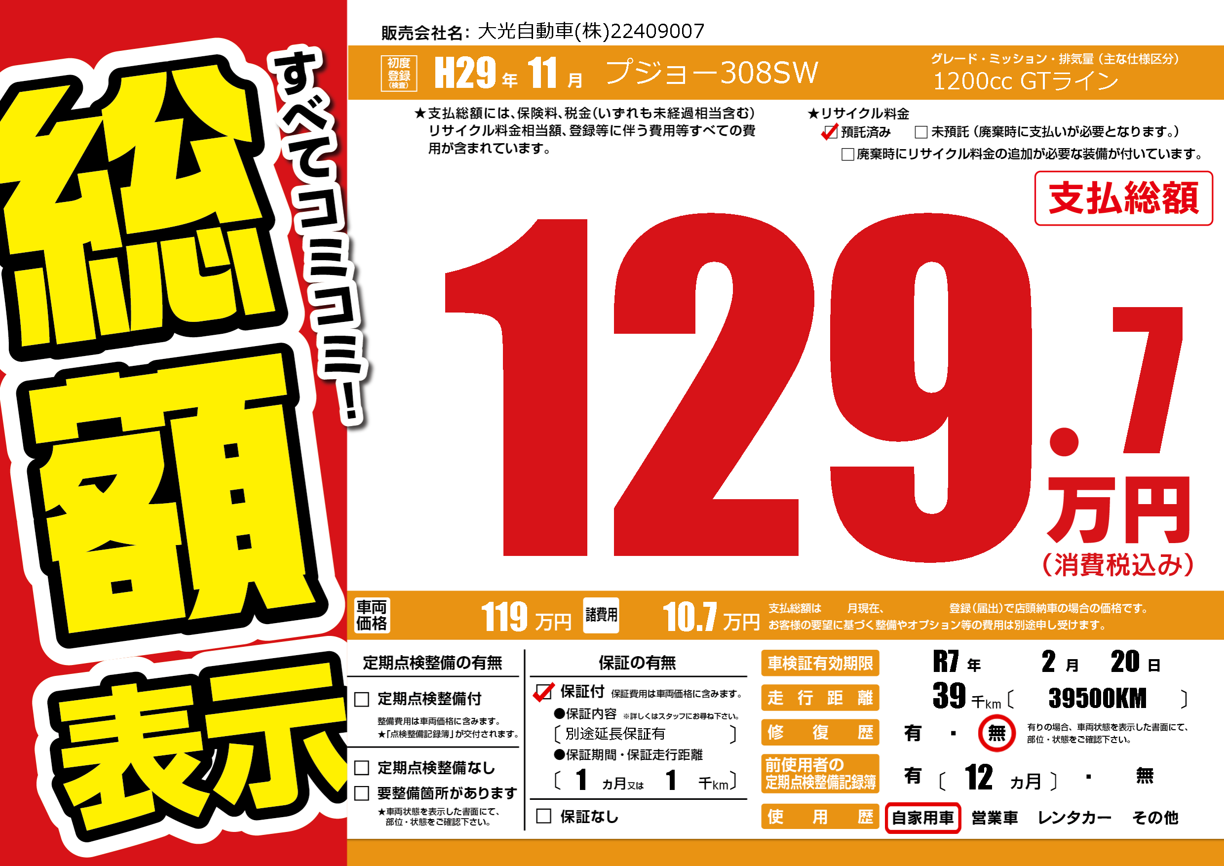 | 車名 | プジョー308SW | グレード ミッション 排気量 |