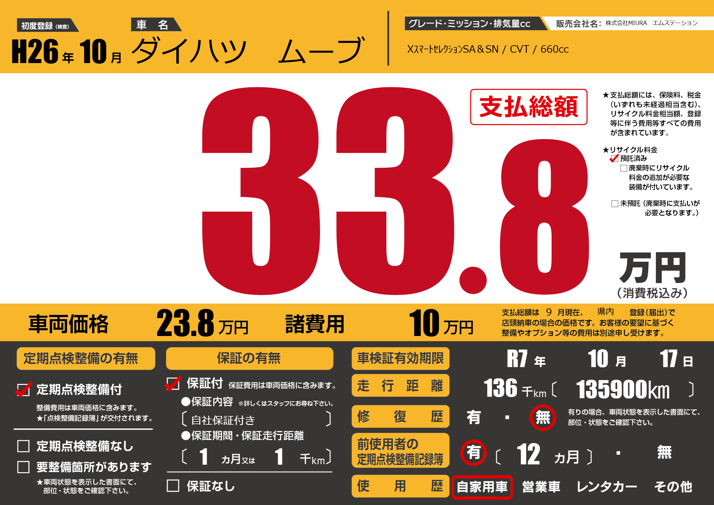 | 走行キロ | 13.6万km | 初年度登録 | H26年10月 |