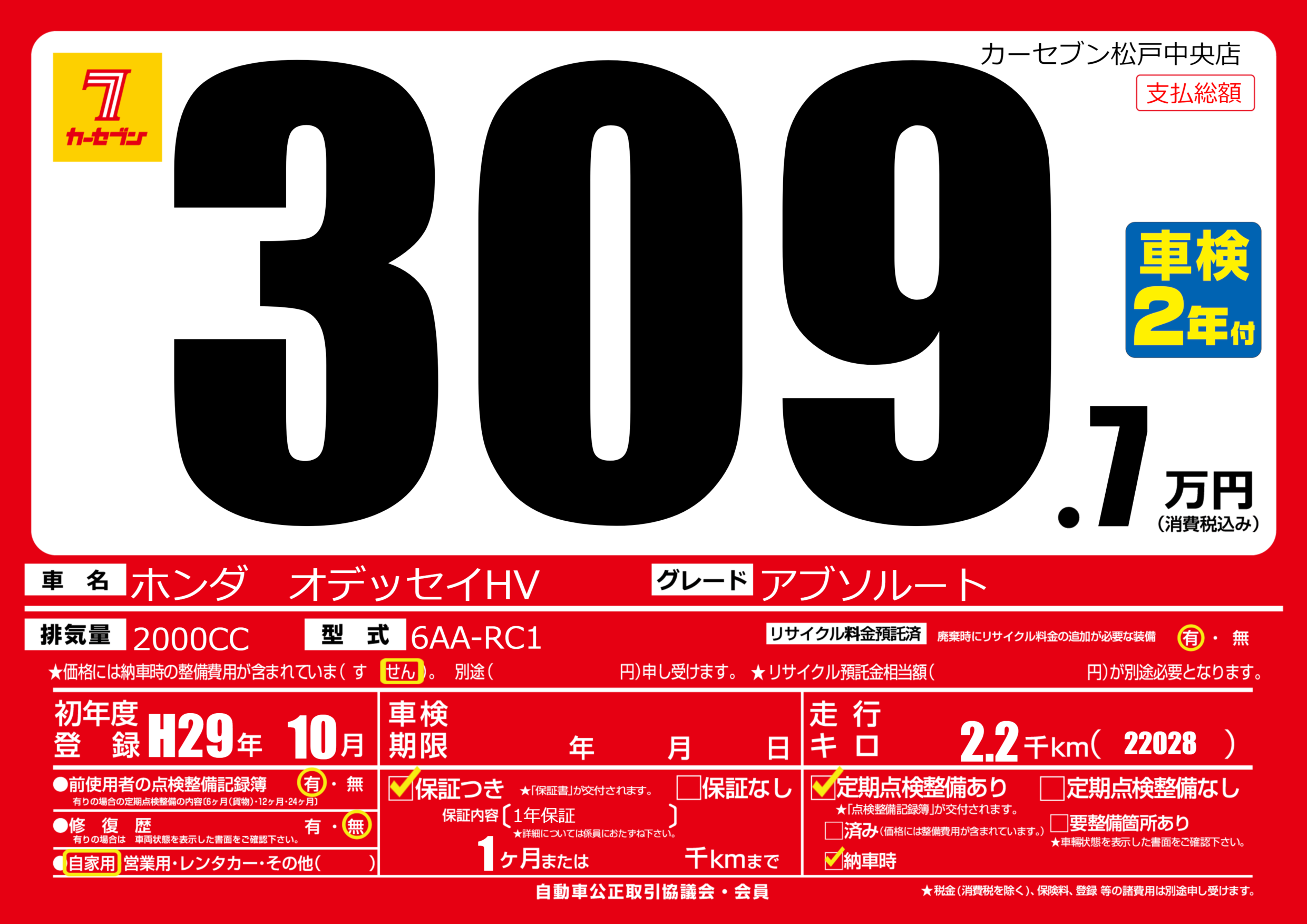 | 走行キロ | 0.2万km | 初年度登録 | H29年10月 |