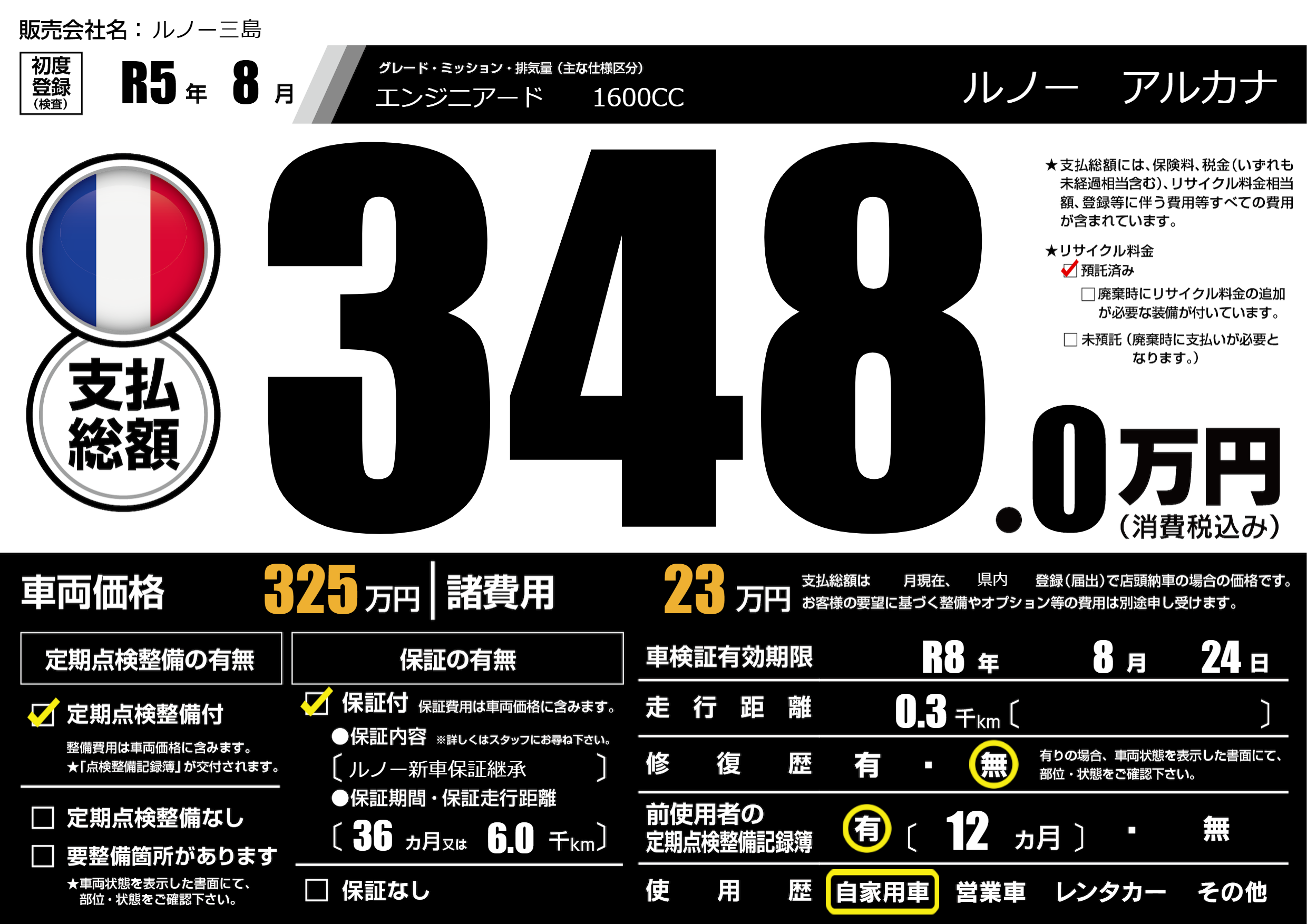 保証なし 保証内容(ルノー新車保証継承) 36ヶ月または(6.0)千kmまで |